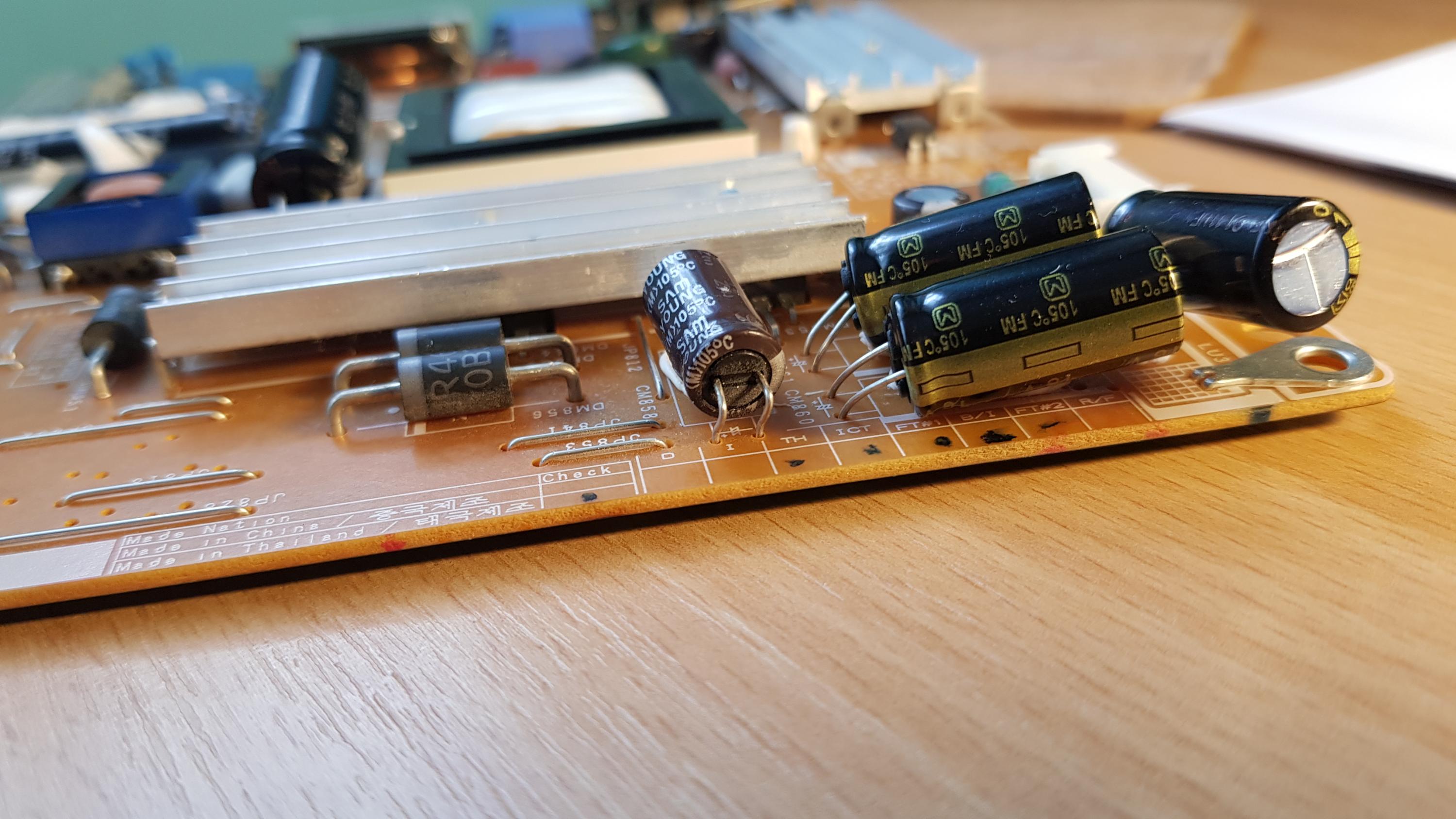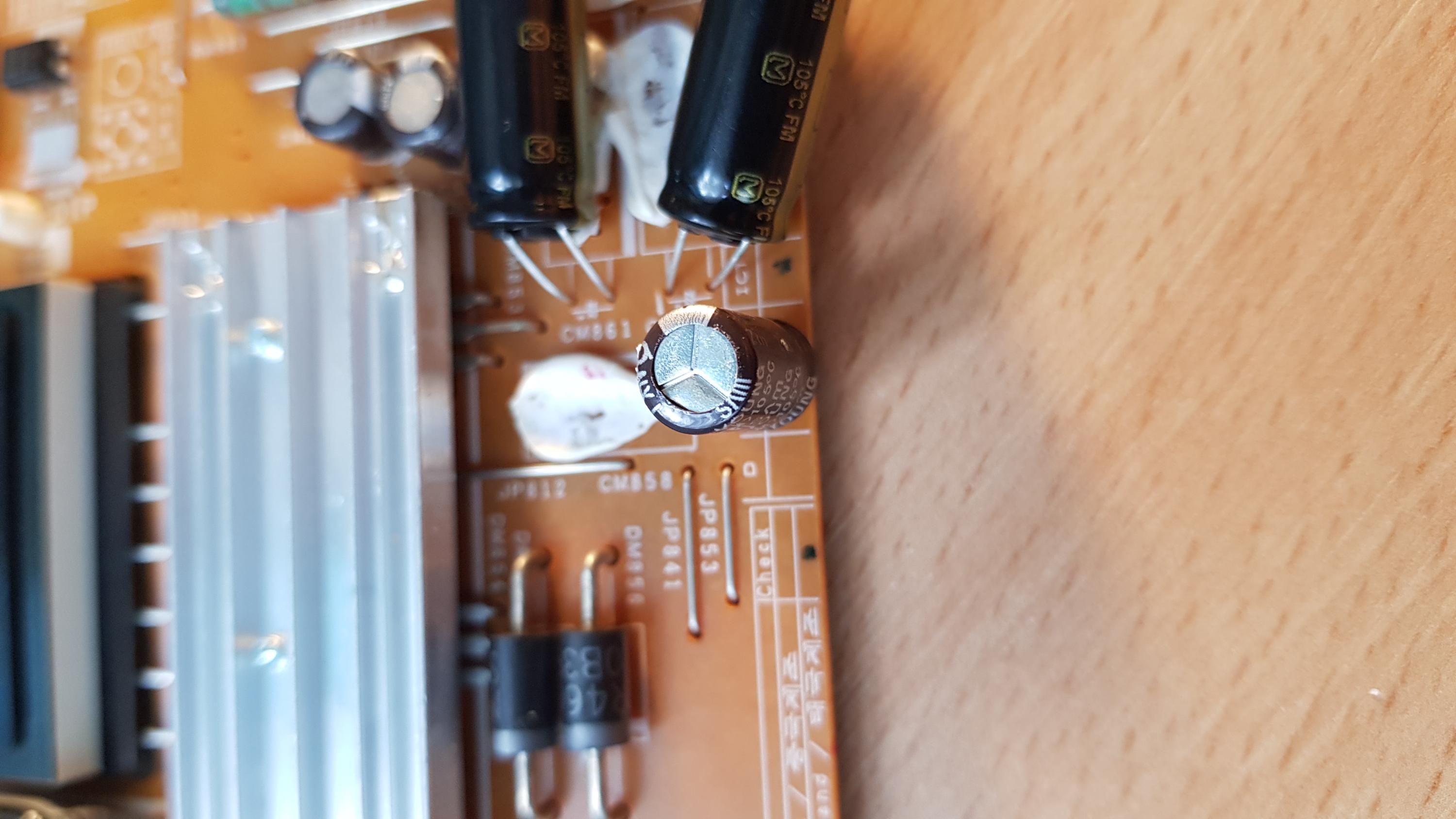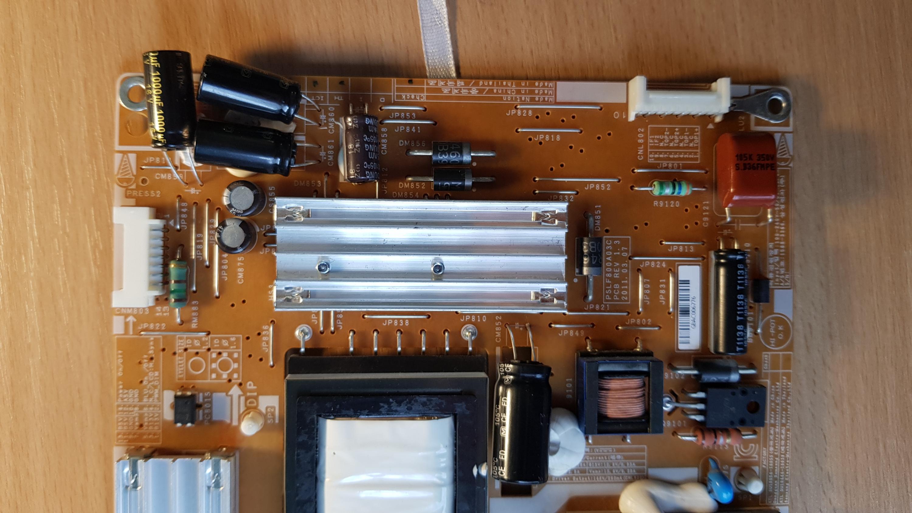 I'm having an issue with my son's Samsung UE32D5520. The television will turn on and off within 3-5 seconds. The screen starts, I get the Samsung logo, then it goes black and off. I have replaced 3 capacitors (2 x 16V 1000uF and 1 x 200V 68uF) on the power board (BN44-04660A) as a shot in the dark after reading some information online.