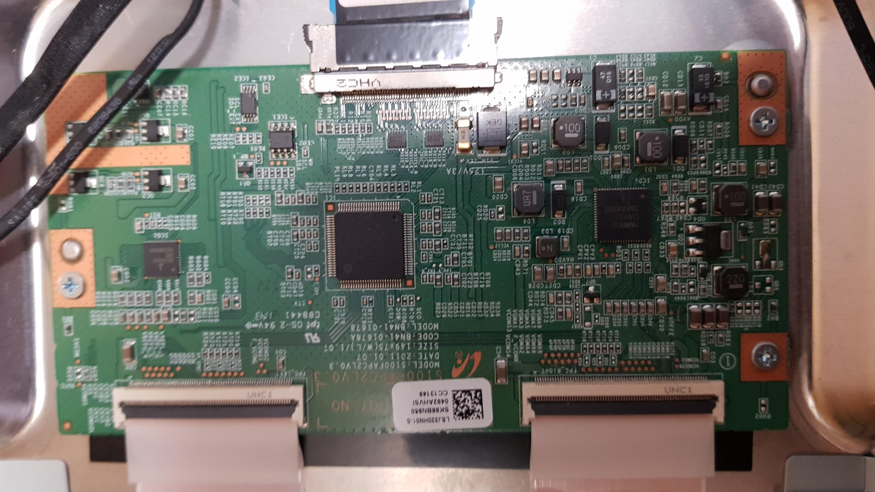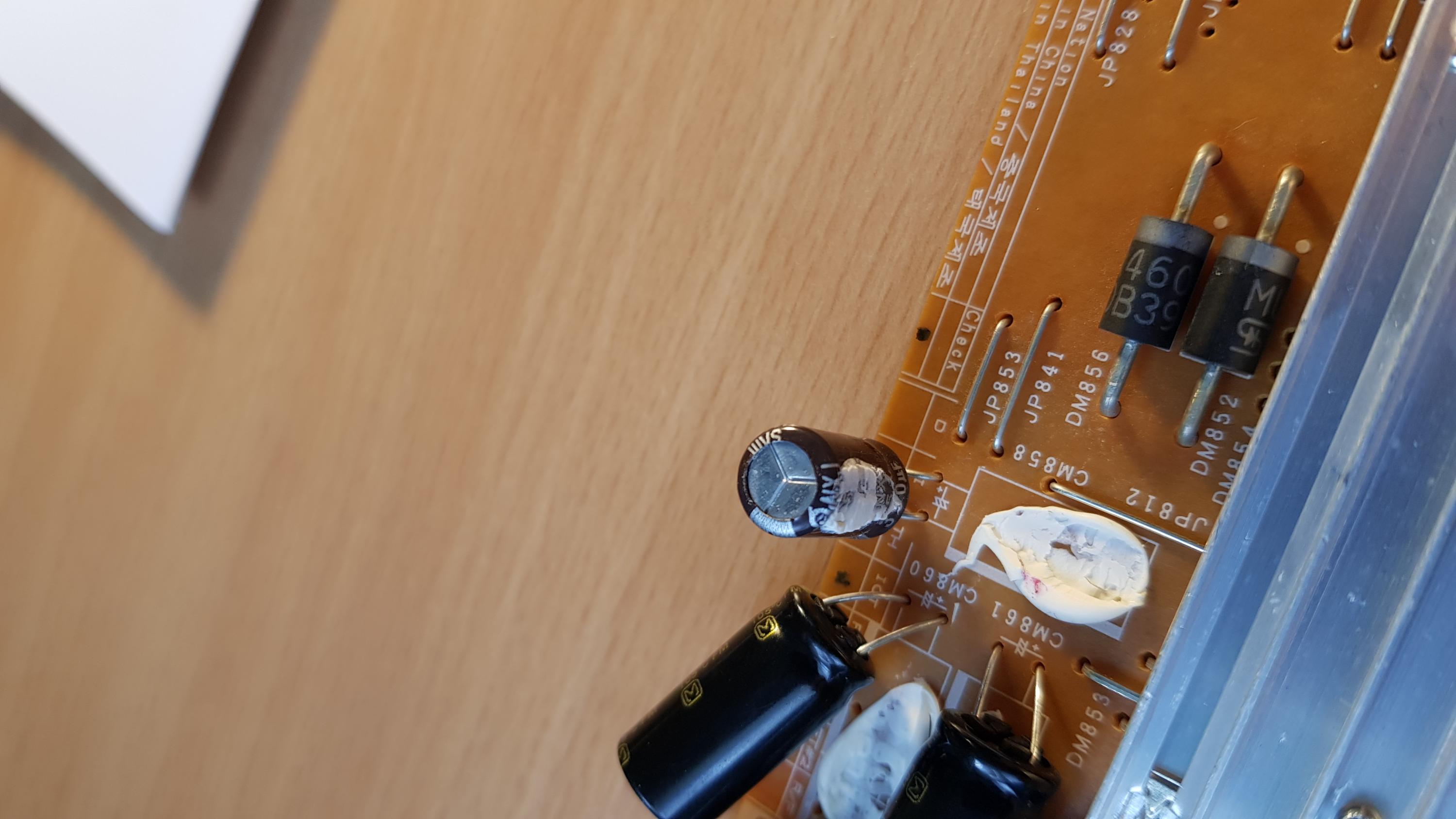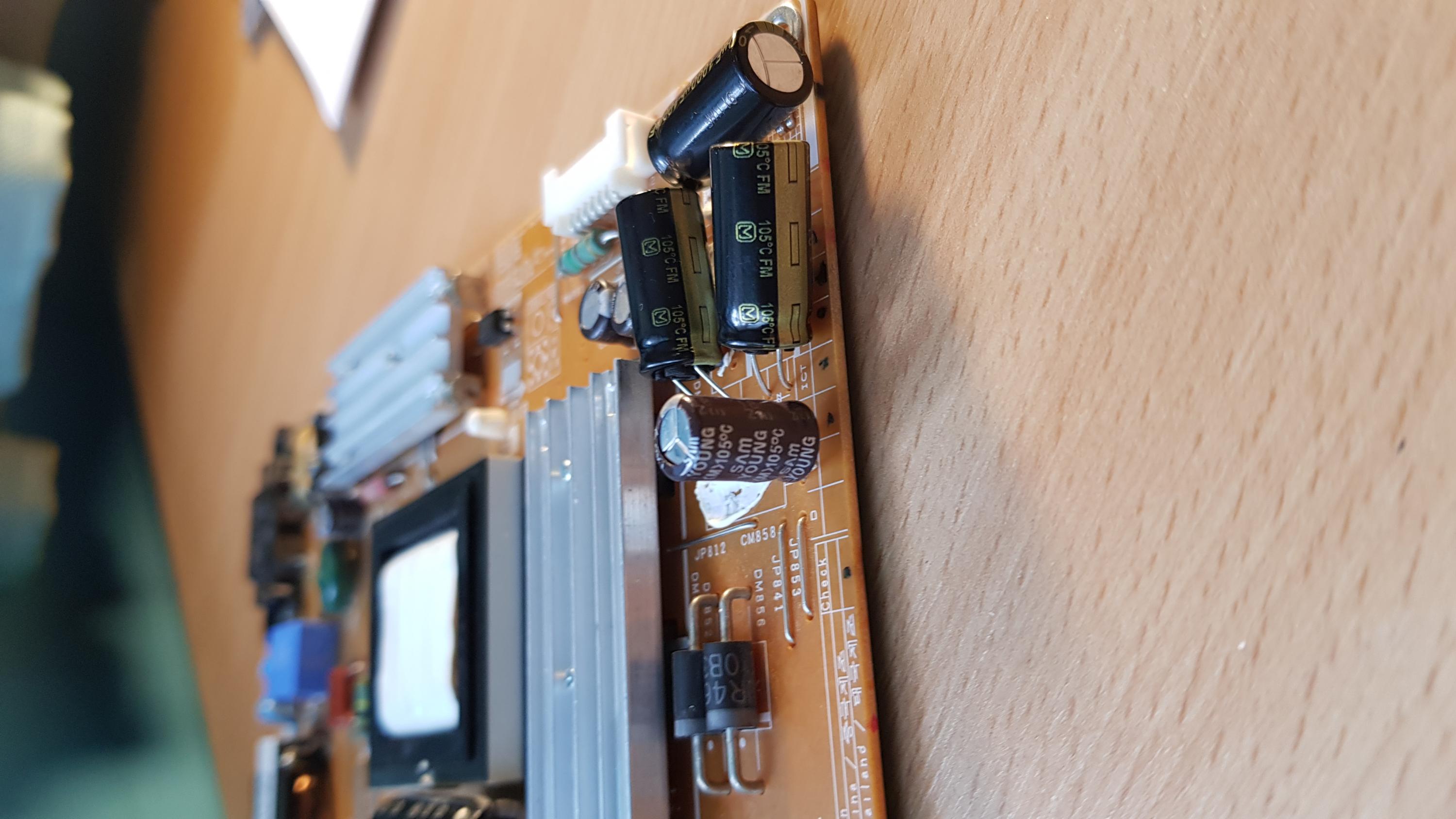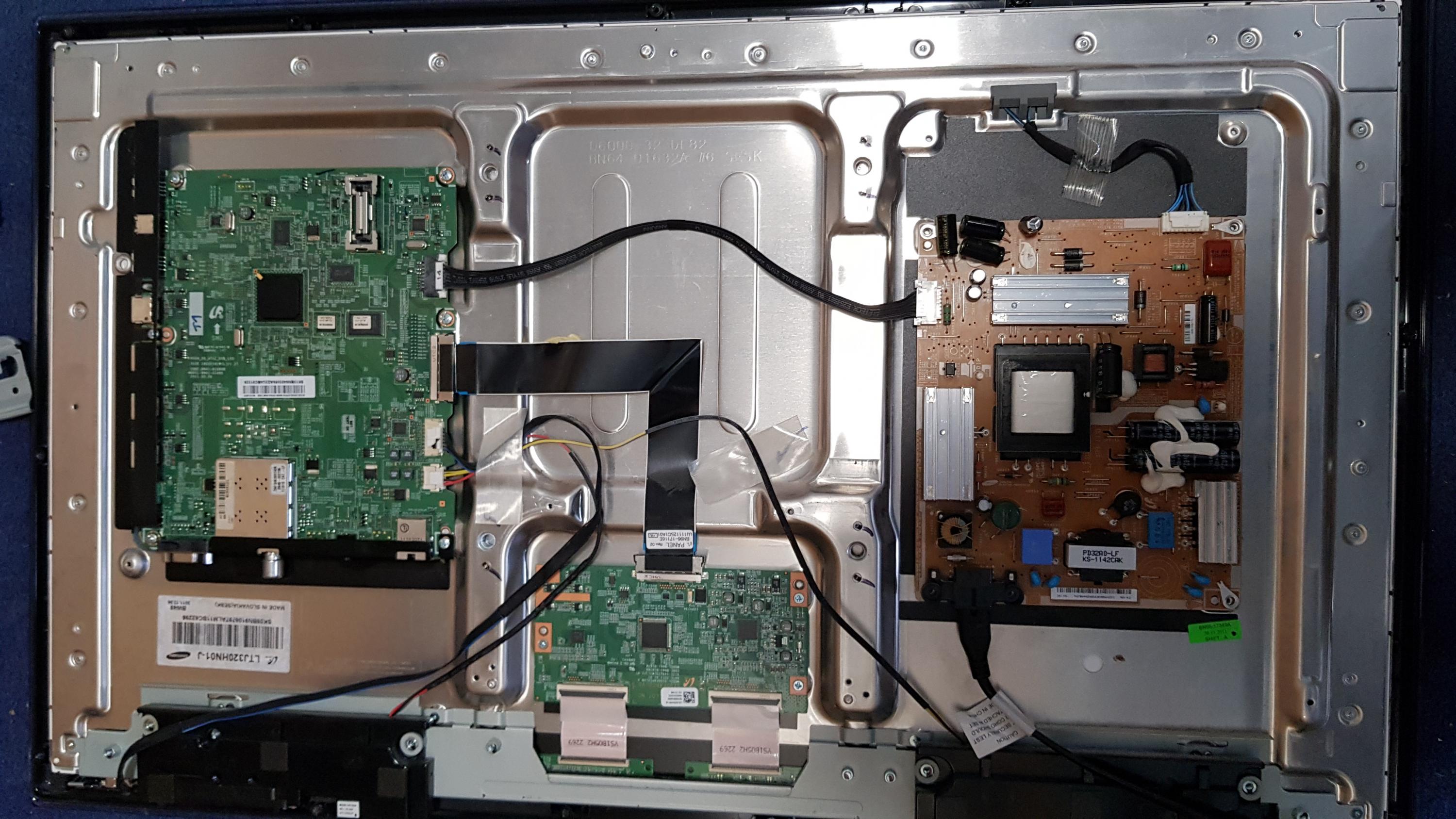 I'm having an issue with my son's Samsung UE32D5520. The television will turn on and off within 3-5 seconds. The screen starts, I get the Samsung logo, then it goes black and off. I have replaced 3 capacitors (2 x 16V 1000uF and 1 x 200V 68uF) on the power board (BN44-04660A) as a shot in the dark after reading some information online.