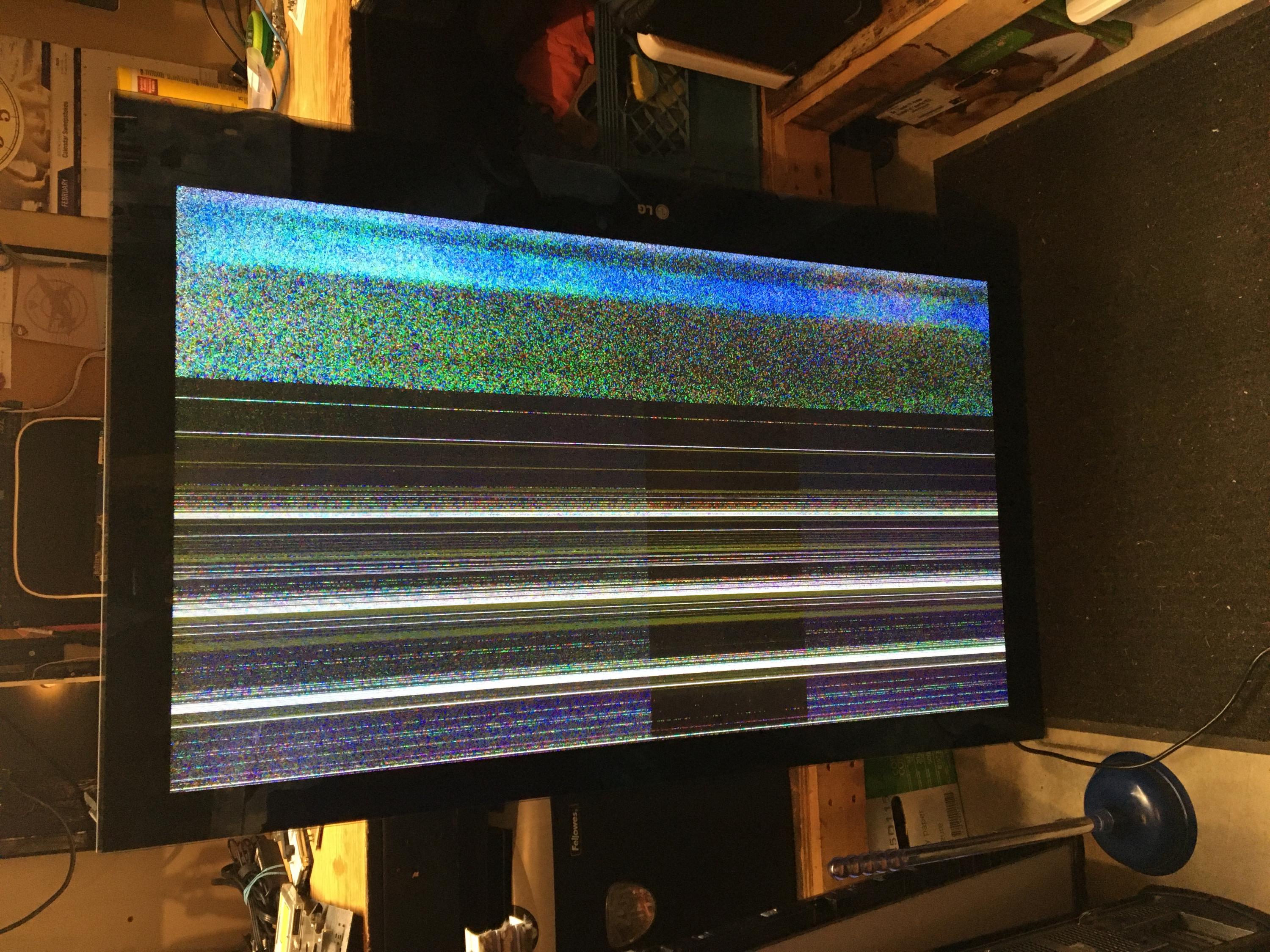 hi fellas. i picked a freebie locally it is a lg 50 inch plasma with display issue. tv turns on i can navigate thru the side button controls volume is good channel up down etc. looking thru the other postings on this system there seems to be a variance of different issues with this model. any direction as what would cause this display issue. sorry my pics are sideways as i don't have the stand and the darn thing weighs a ton. Thanks.