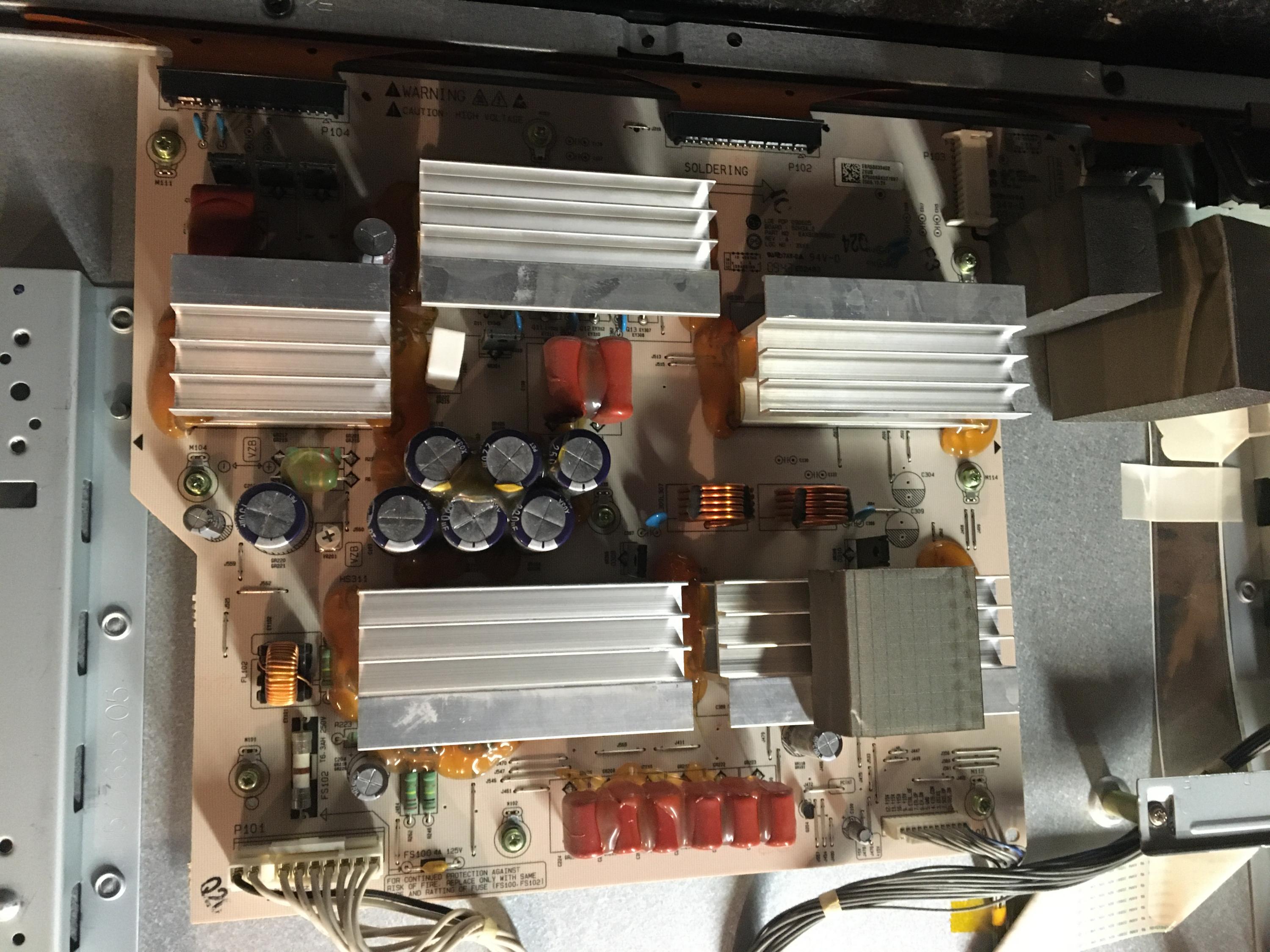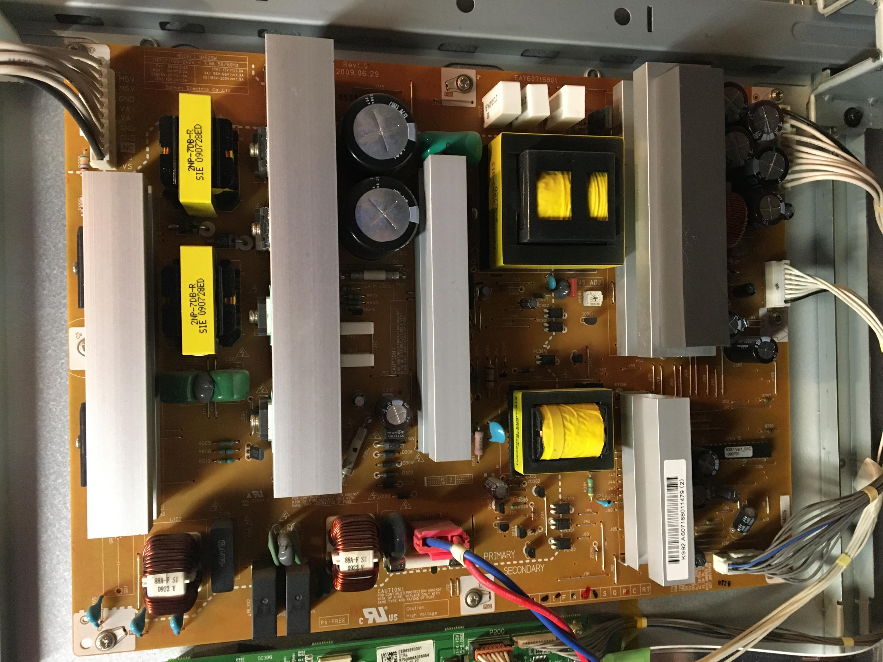 Looks like and older one, I’ve had mainboard failures countless amounts of times with this model-BGA solder fails on the CPU due to poor cooling, disconnect the main LVDS cable and on the control board P6 or Auto Gen you need to jumper pins 1 and 2 and the display will show a series of different colours. Let us know what happens.Please Do Not PM My Page Asking For Help Badcaps Is The Place For Advise, Page Linked For Business Reasons Only. Anyone Doing So Will Be Banned Instantly !