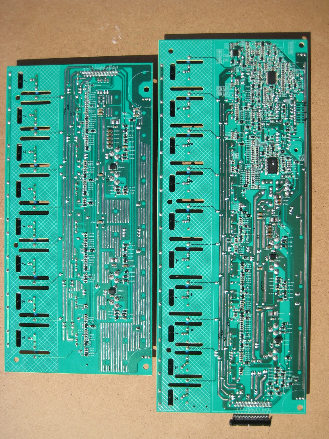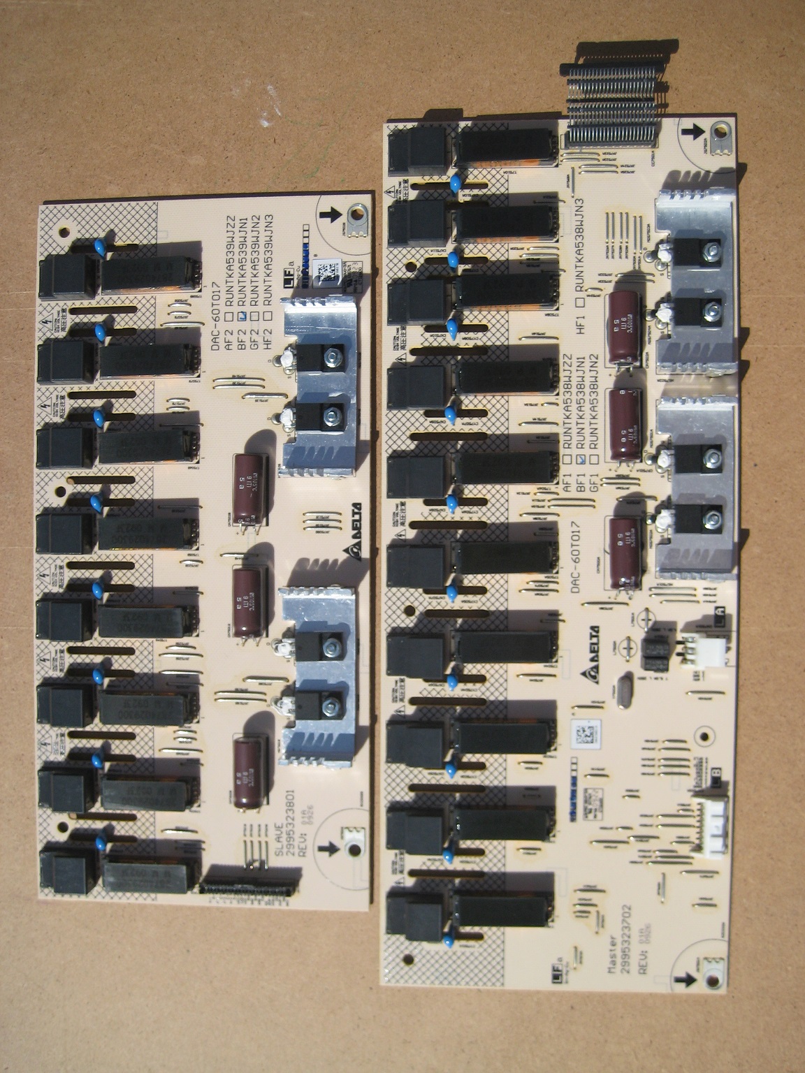 I then re-connected the master inverter board but disconnected the slave inverter board. In this configuration the power unit also stays alive, and this was also the first time I had noticed any of the backlights briefly flickering on. After re-connecting the slave inverter and with the room darkened I could finally see that the backlights have actually been briefly lighting up all along, but it is much dimmer and has a much shorter duration than with the master inverter alone.
