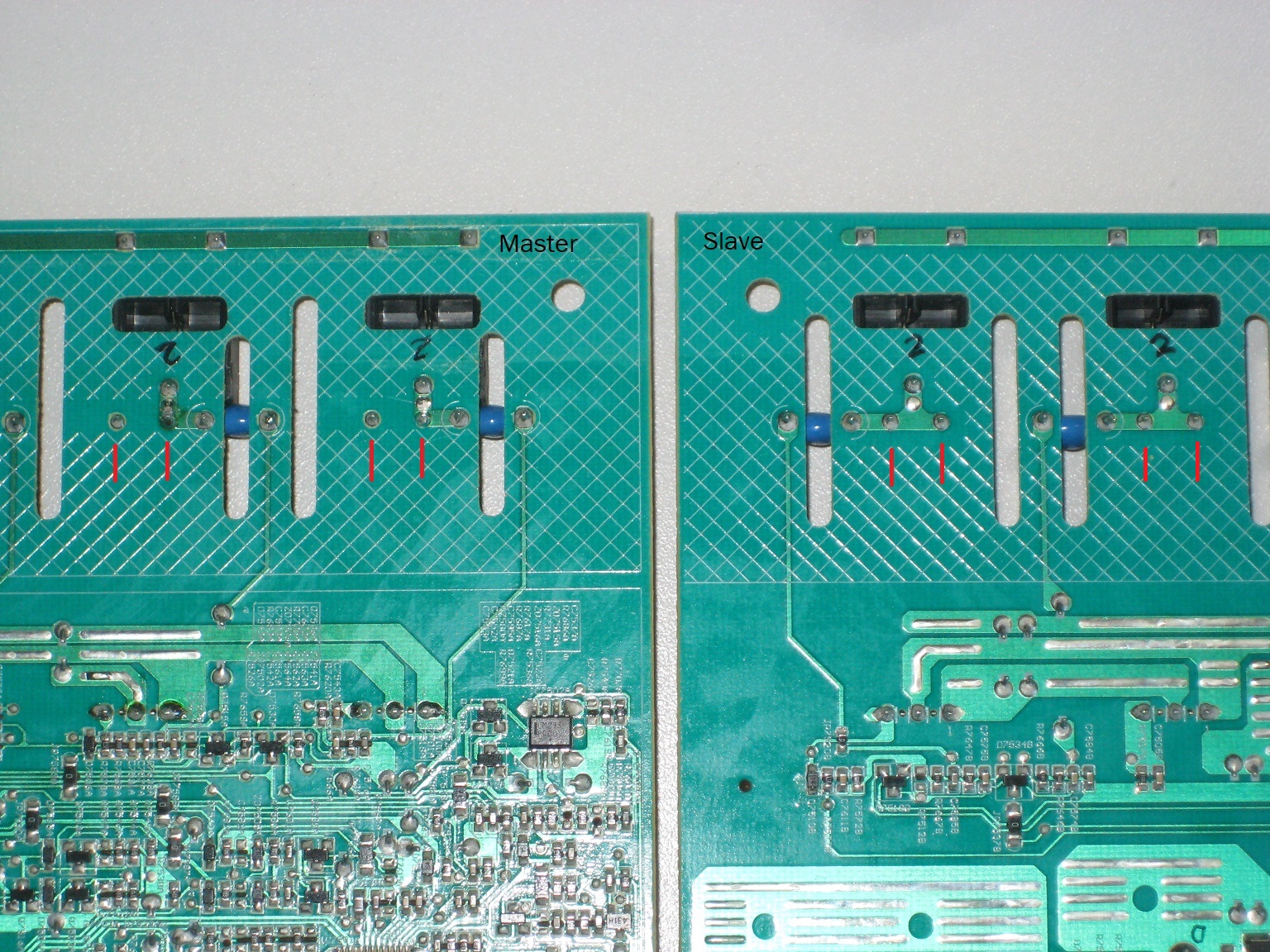 I have tried to troubleshoot the inverter boards using information from old threads, but I haven't made much progress. For example, I tried measuring the resistance of the secondaries on the transformers (as shown in post #29 in https://www.badcaps.net/forum/showthread.php?t=52087), but I get an open-circuit on all 10 transformers on the master. Could they all have failed? On the slave board I read 0-ohms on all of them, but as you can see from the close-up photo this is to be expected because they are joined by a trace (the red lines mark the legs of the transformer). The part number on the transformers is 2874029300; I haven't been able to find any information on them, other than places that want to sell me a new one.