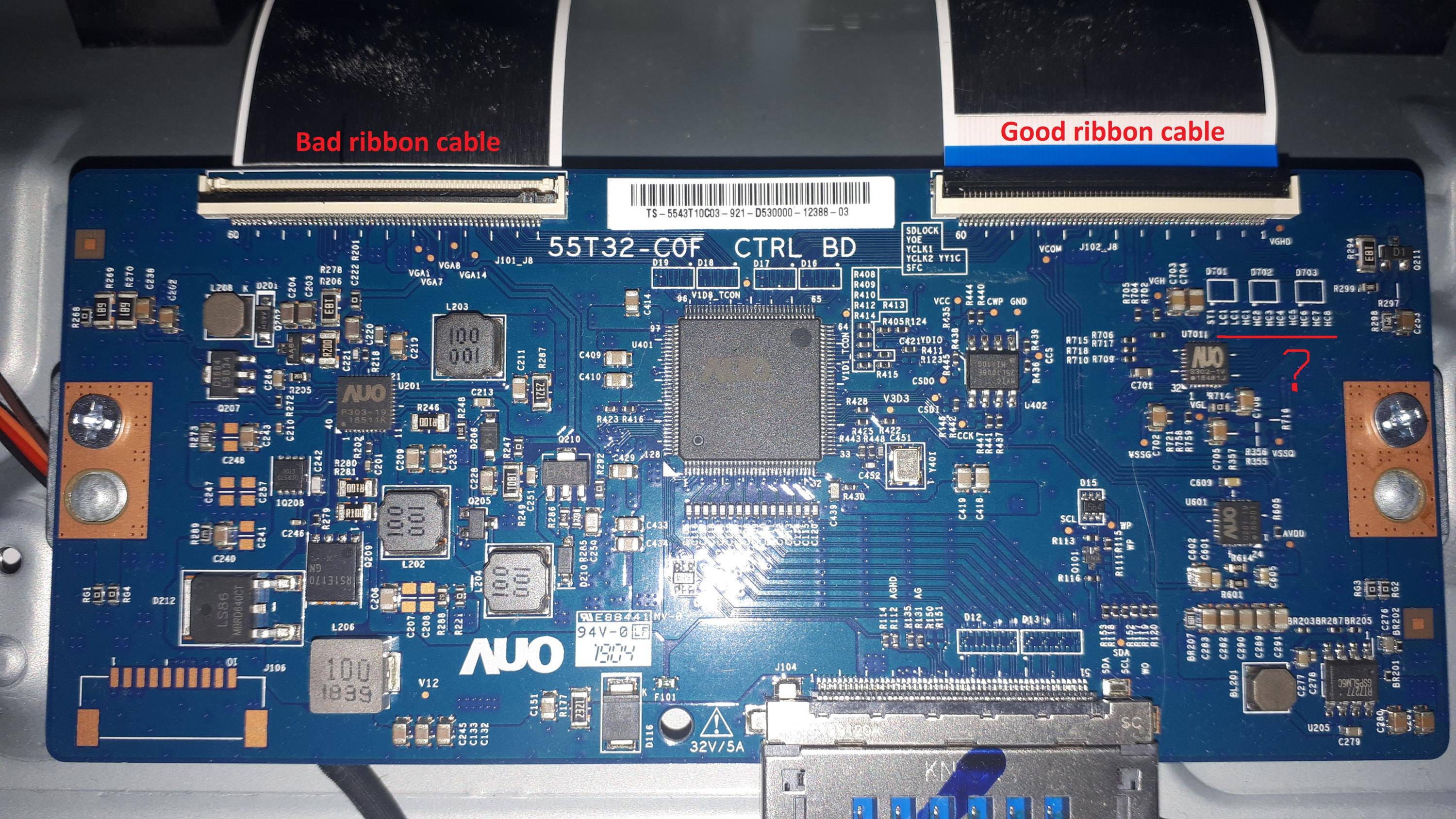 I opened the back of the TV to do a few tests. I tried other ribbon cables to make sure the new one wasn't damaged, but the result is still the same. The problem is still coming from pins #1 and #2 on the left side of the T-CON board, which leads me to believe that the problem is induced by another component.
