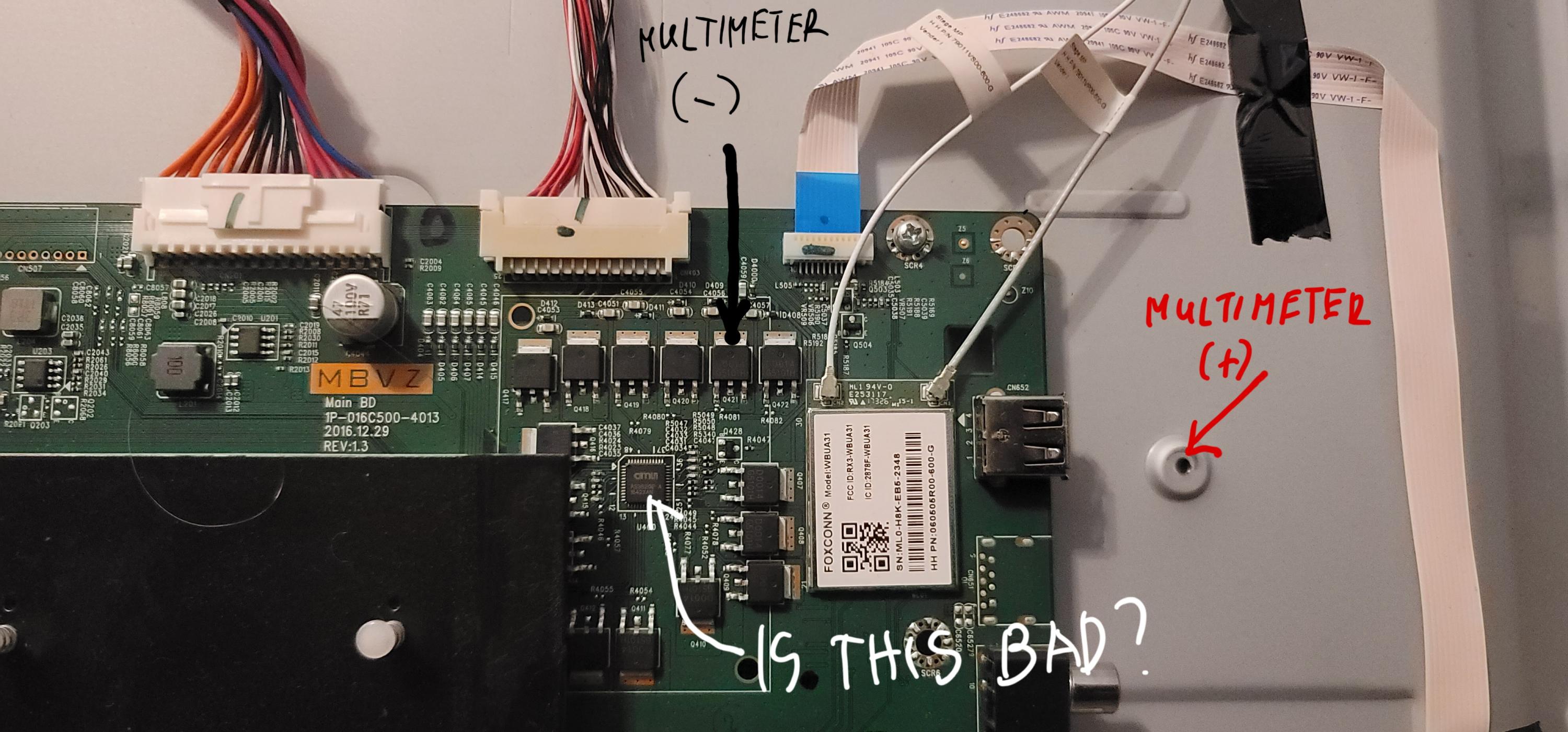 anyway the red wires from the mother board to the LEDs is all having the right output voltage but no GND (I assume its a low side switch circuit) while I was testing the LED switch transistors for GND continuity I placed the multimeter's (+) on the frame and the (-) on the transistor and the controlled strip by that specific transistor is came on.
