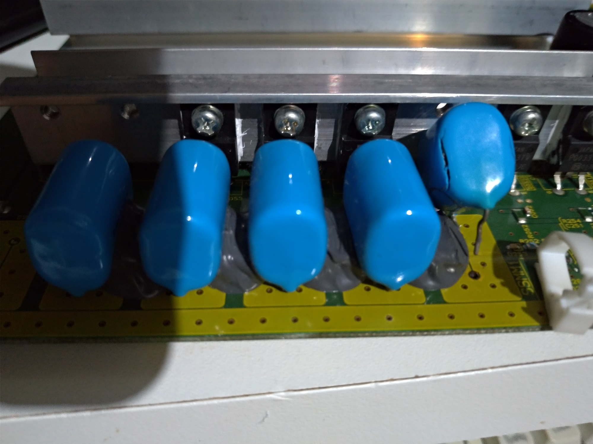 Bought this TV used not working, panel flashed briefly on power up and it was blinking 8 times, a quick look on SS board revealed a common fault on the 3uF 250V capacitors, C201 to C205 (C1620X in the service manual), the solder joints were all cracked, C201 and C205 pins were darkened and some sparking had occurred on them, C201 was split open and clearly overheated in its last hours, replaced that one and resoldered the others, 8 blinks fixed.