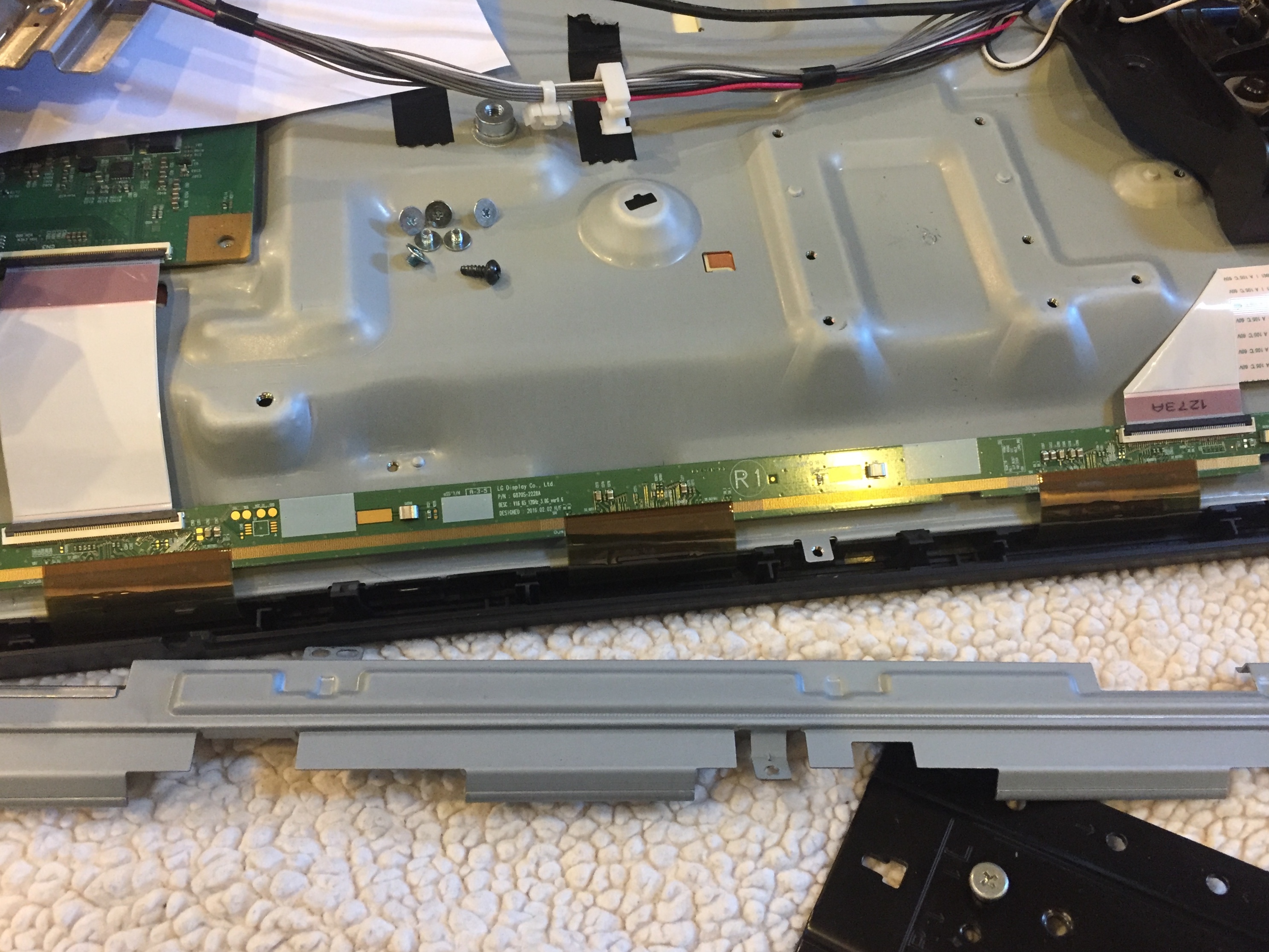 So, is it safe to assume that there is a short circuit in the right panel PCB? Not sure what that board is called... y-board? When I disconnect the cable bridging the two portions of that PCB I still get 5 blinks, so I assume the short is in the left portion and is triggering some sort of self protection shut down. Yay/Nay? Any advice on how to further narrow down the short? I tried testing the resistance of the little capacitors. One seems to show no resistance, but the the equivalent on the opposite PCB (on the working side of the screen) showed the same value, so I'm not sure that's it (not that I know what I'm doing).