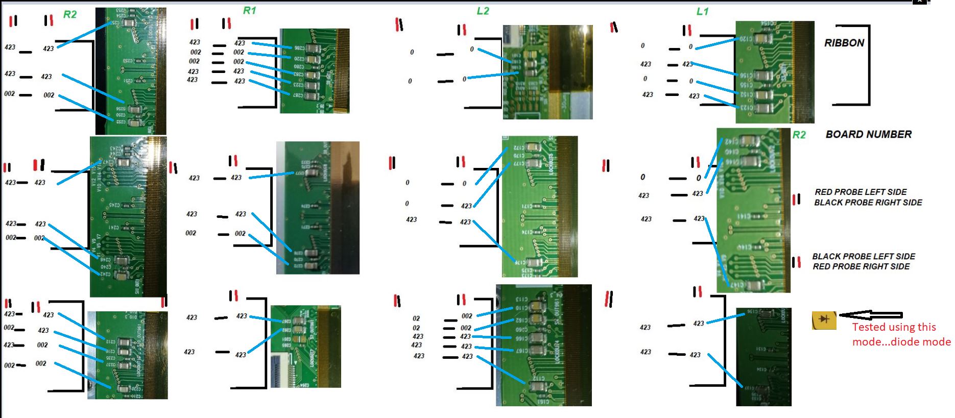 Double check the capacitors on these board (on your faulty screen), put diode mode and check each capacitor leg-to-leg, also check each leg against the ground. If your meter doesn't beep it's gonna proba ly show ~030 for shorted caps vs ~600+ healthy ones. Most likely you will find quite a lot of shorted caps, the problem is determining which one of them actually causes it.
