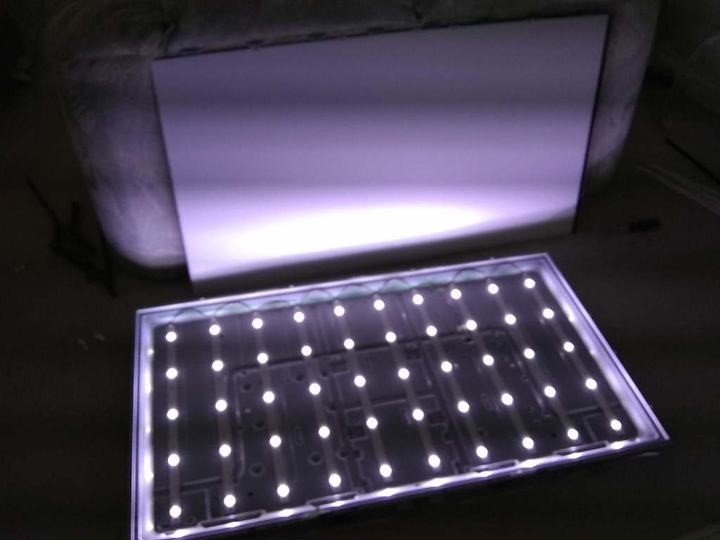 Here are pics as promised for a blue backlight Hisense 55H5C. Yes the panel boards go on top. I remove the back screws with the TV vertical. I barely touch the panel and let it drop out (two small pieces of tape holding it down on this model). Used suction cups to adjust the panel down a couple of mm after dropping it back in. Better to have the strips in hand than to have the TV apart for extended periods. Always test the backlights with them exposed and with the diffuser sheets installed to check for dirt, dust, and evenness. Also be careful lifting up the chassis. I did a LG 50LN once and cracked the panel by lifting the chassis from the side and it twisted cracking the panel.