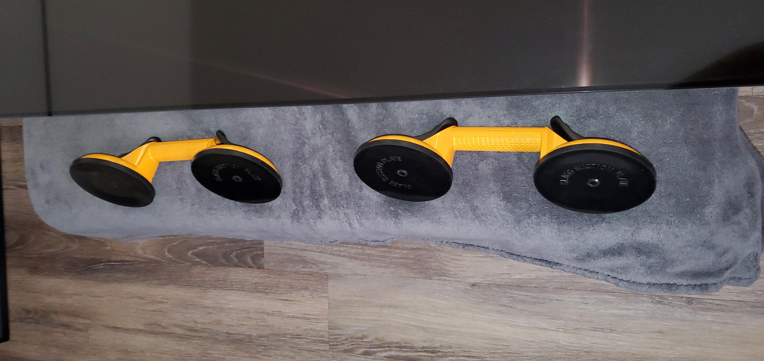 Didn't want to use suction cups, I'm afraid for breaking the glass with creating a to strong vacuum with those suction cups and lifting the glass horizontal.