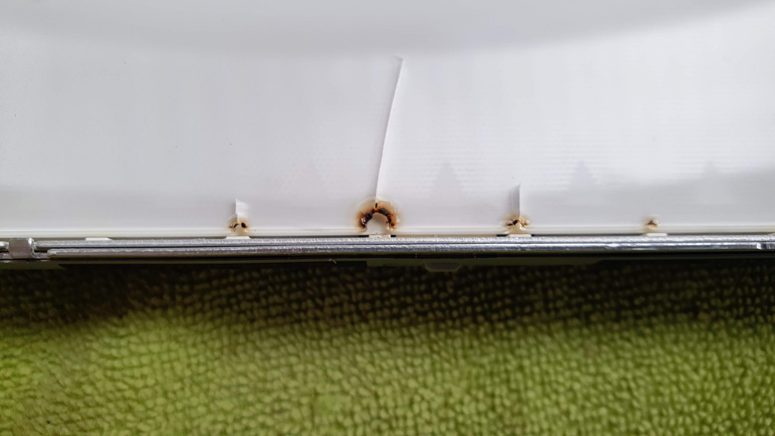 Upon opening this hellish screwless design and having almost a heart attack to take the panel off without damaging it, I was met with a big meltdown on the left side(from the front) and some cracks on the acrylic.