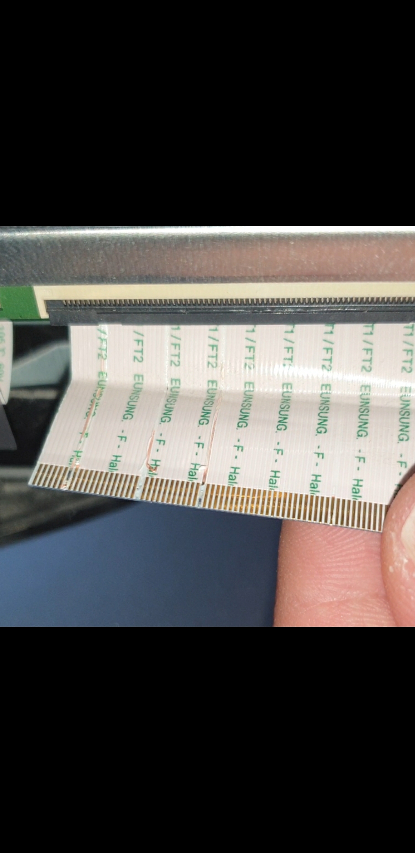 3 pins are missing and complete cutted ribbon cable. i used also tape and clued over the damaged pins and screen was black, and now i need only new cables and tv will work again, hopefully. i mean, i can hear sound, the OS is working.