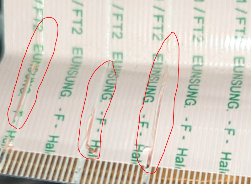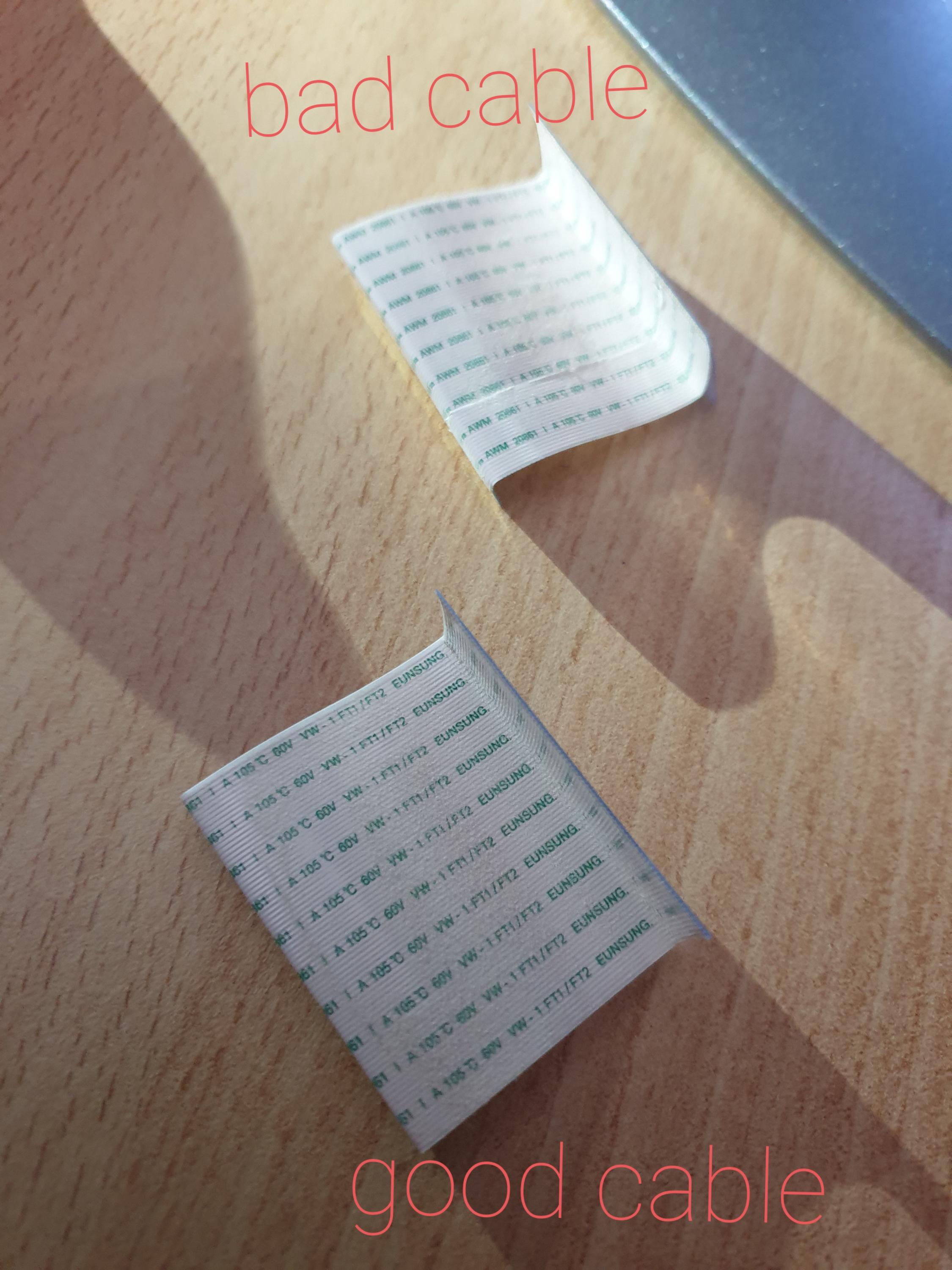 And i removed the cable sometimes, and i had to struggle to reinsert the cable. maybe it happend there. yes, the cable with the lost pins, for me it was looking like cracks, because it's from top to bottom.