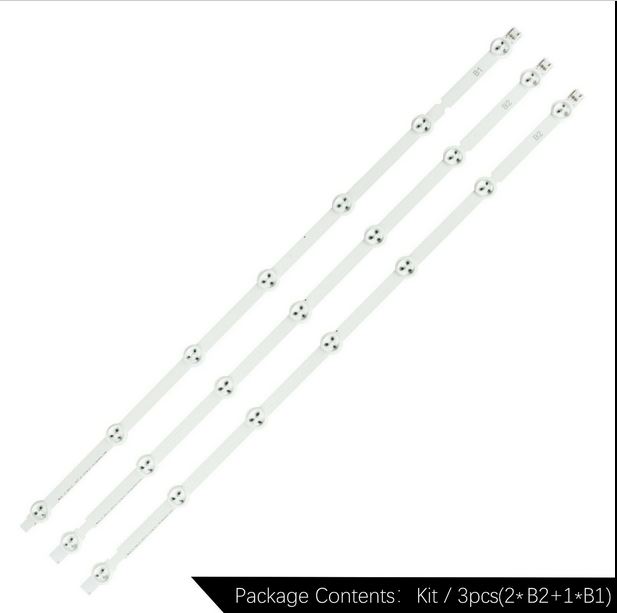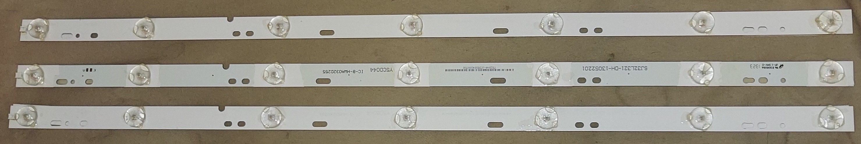 Those strips looks like they are for LG models. You will likely have to wire direct and cut new holes in the reflector sheet. For a 32", it isn't too much work and they are likely wired in one long string but you don't want to do this for for larger TVs. If the lenses are different, you may get an uneven backlight but don't think it will be an issue in a small TV.