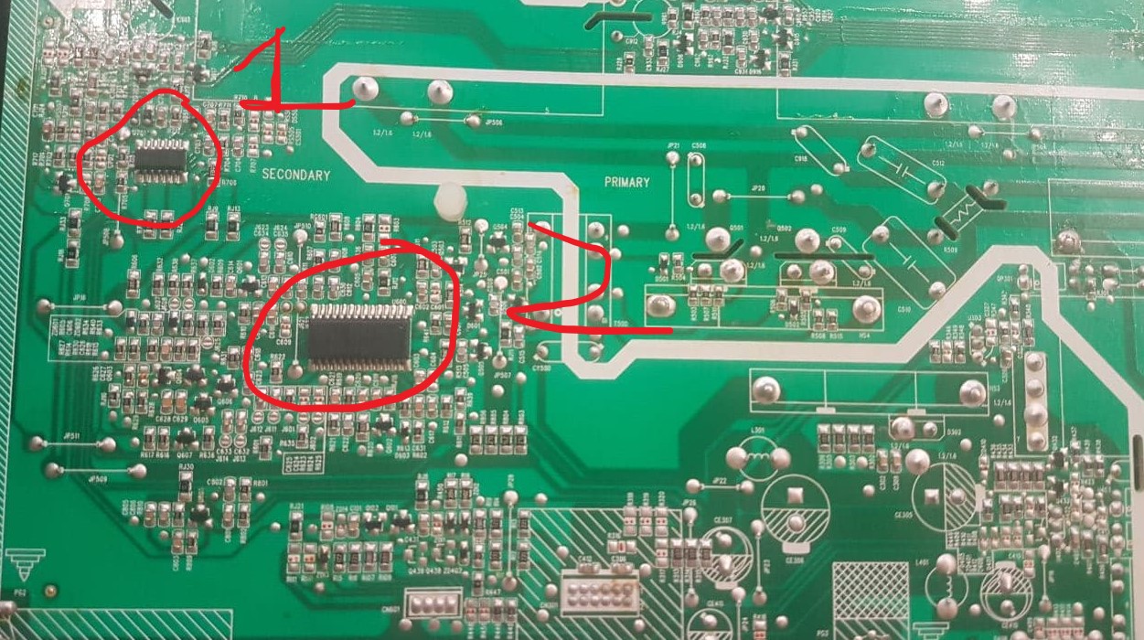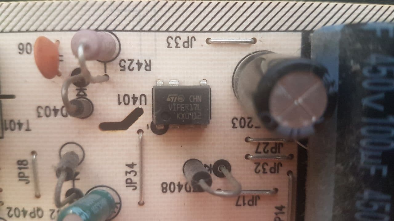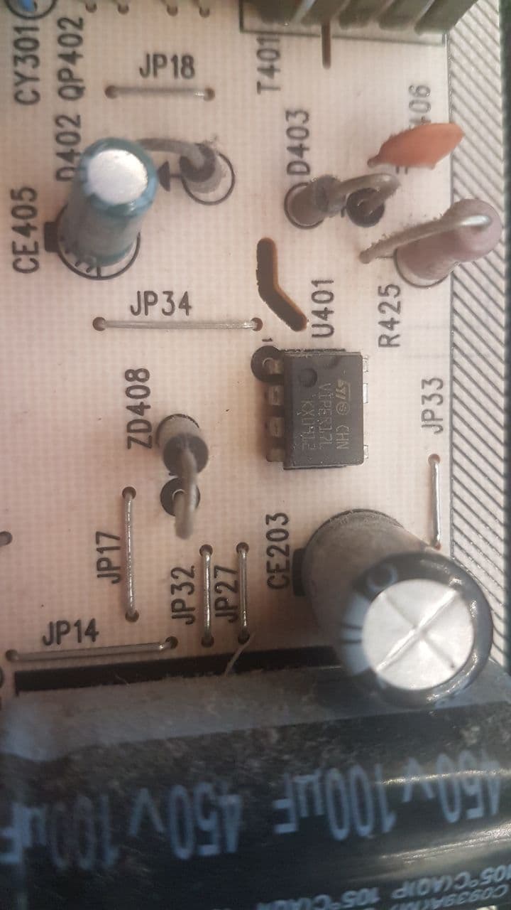 I really appreciate the reply, I've attached some more detailed photos below of the board model number and the IC. The IC is a 7 pin ST VIPER17L, one of the pins is missing however this is intended as there is no hole on the PCB for it. I've measured the voltage across cap CE203 and there is a steady 100v DC. There are 4 more IC's on the bottom of the PCB (images below) 2 on the cold side and 2 more on the hot side. I've also attached the datasheet for the PSU below, it's not for the exact model that I have but the component names seem to match, here are the IC names relative to the images below: