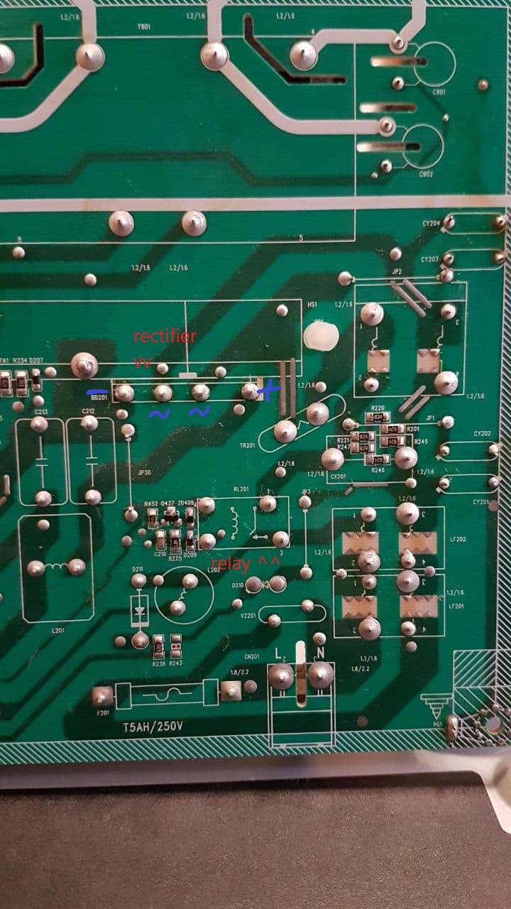 Hi, I've got a B109-901 power supply that is absolutely dead, it has no standby voltage and the main bridge rectifier (highlighted in red) has no ac input voltage, after prodding around for a bit I found a relay that is responsible for delivering mains voltage to the rectifier (highlighted in blue) which for some reason isn't closing when I power the board on, I tested the relay and confirmed that it is good however it seems to have no voltage on it's coil. I followed the traces on the PCB and one of the pins of the relay's coil seems to connect to the rectifiers DC - output while the other goes onto a very complicated array of surface mount components, any ideas on what purpose a relay like this serves? why would you want to disconnect the rectifier from mains?