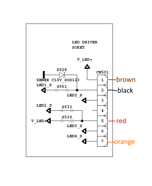 One thing I found out is that both led+ pins are connected with a bridge (S530, see picture below) but I think that's how it supposed to be.