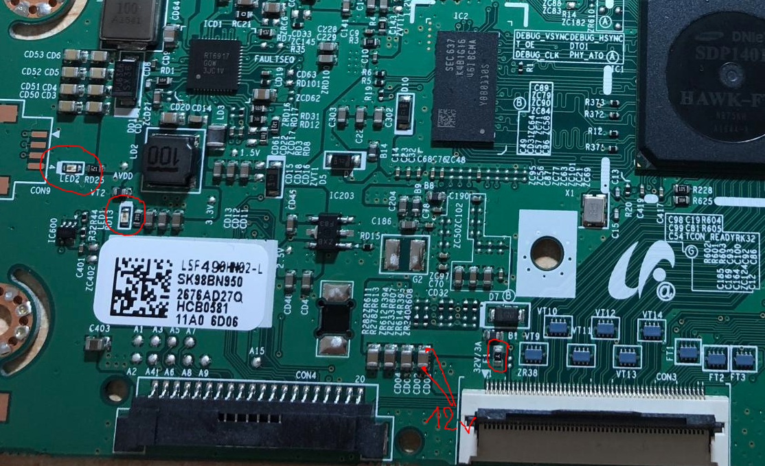 Also, see what voltages you get, you need 12V from MBO, and then on tcon you have AVVD, HAVVD and etc.