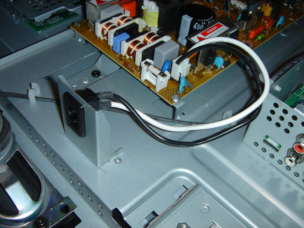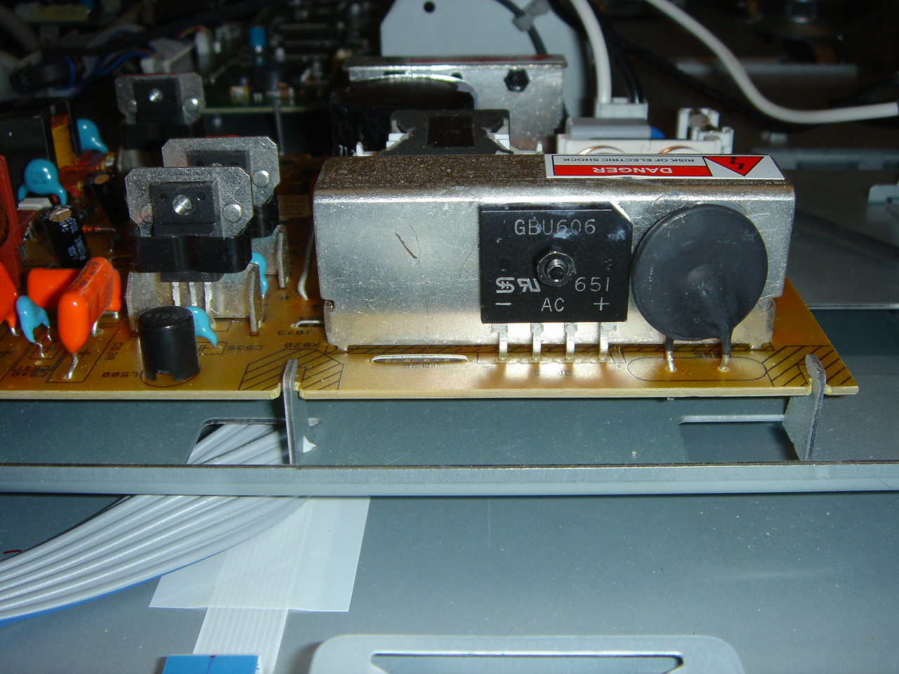 Testing the power wire by itself plugged in I get 115VAC. However when connected to the TV, I get 6-7 VAC from the white plug located on the lower left of the power supply. Does this seem odd that the voltage reduces to much? The gray block is a capacitor and it's identifier is C010.Originally posted by PlainBillIf the fuse if good, check for AC at the power cord connector. Also, what is the identifier for the large gray block right above the bright blue NTC thermistor? It looks like it could be either a relay or a capacitor.
