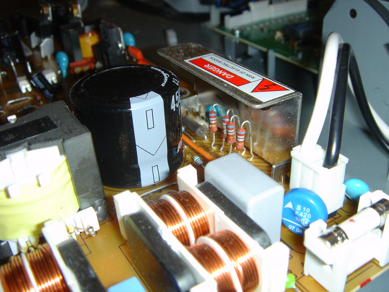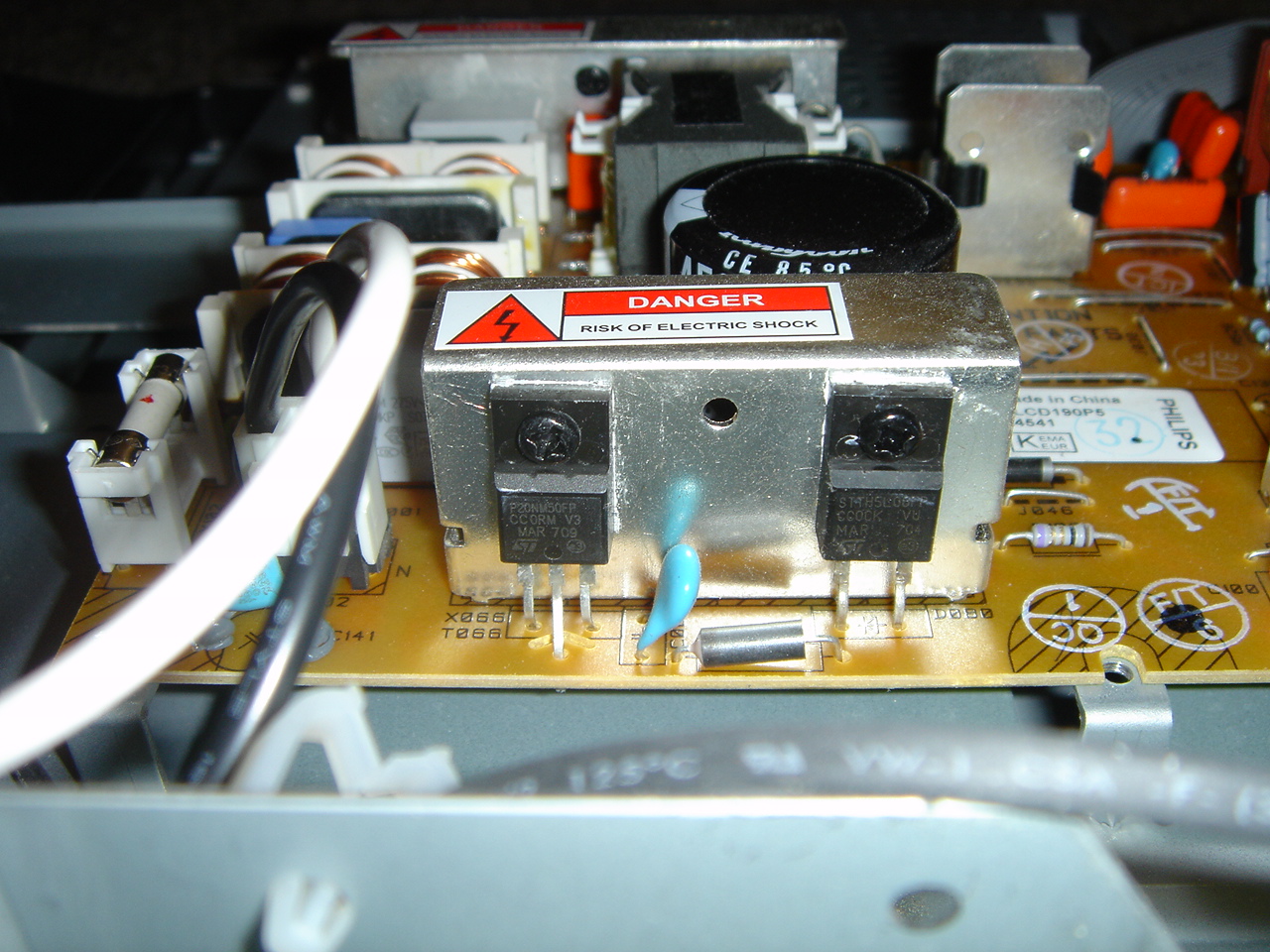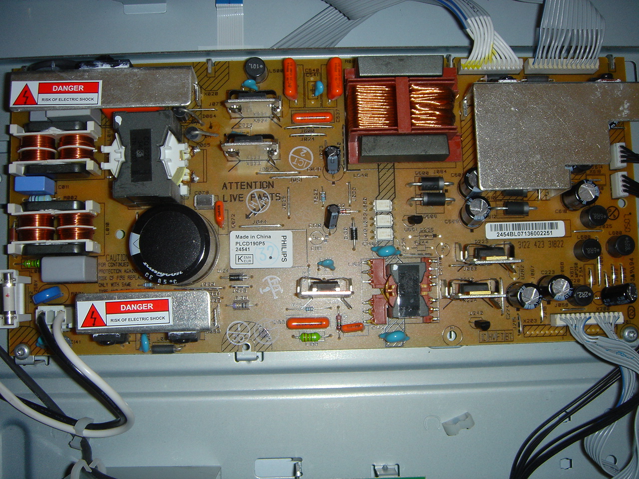 One obvious cause is that big white label right smack dab in the middle of the picture.Originally posted by xclusiveplayerI have a Philips 32" LCD manufactured in 2007 that have been working for the past couple of years. One day, I turned it off and it wouldn't power on again. When I press the power button nothing happens i.e. no power light, nothing is displayed to the screen. All the electrolytic capacitors are from a reputable brand (Rubycon) which are all flat and shows no signs of wear. When plugged into a power outlet my multimeter shows no DC voltage to the biggest capacitor. Anyone have any ideas what may be the cause to this problem?