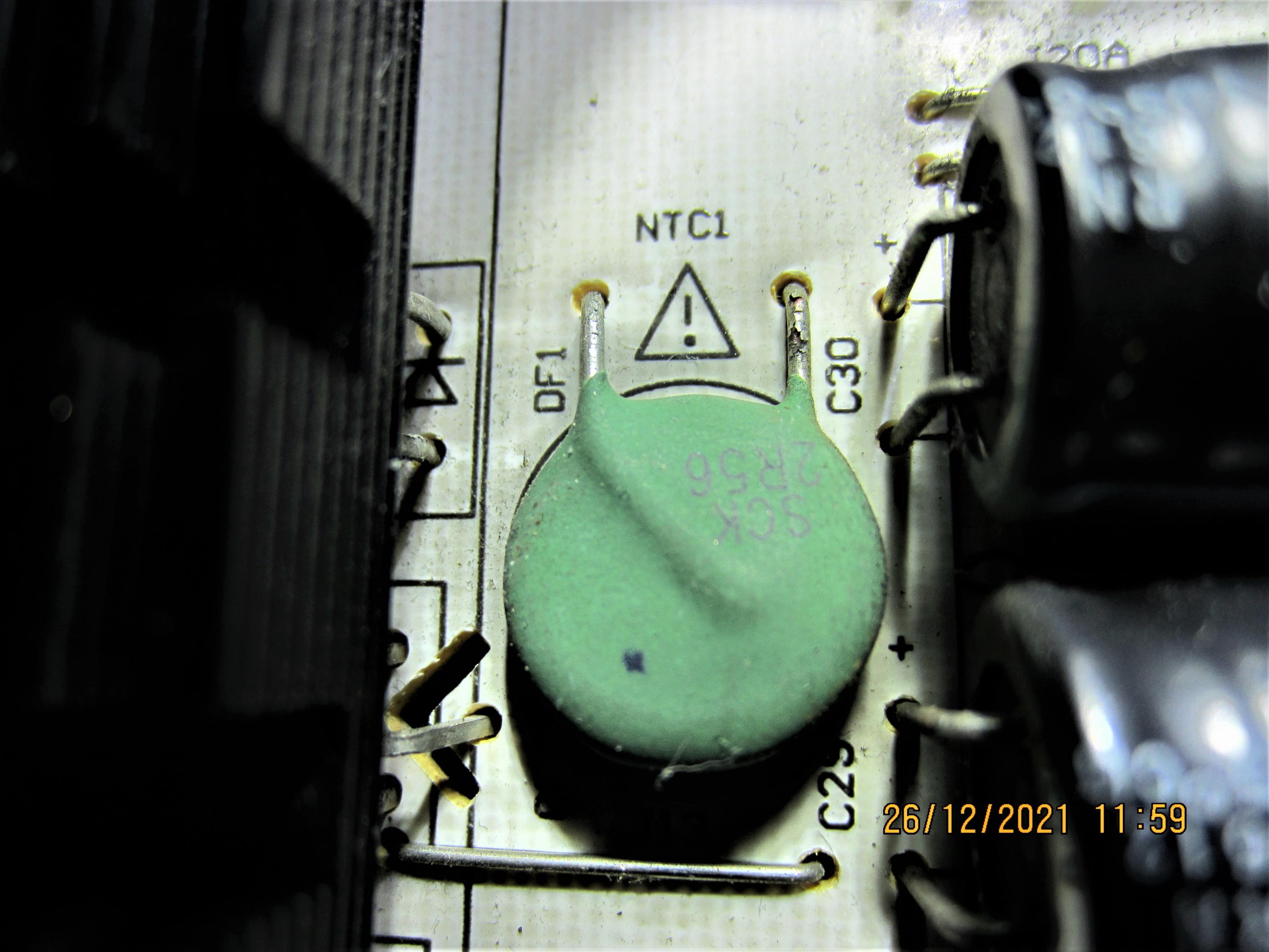 That PS nomenclature is not clear, usually there's a PS-ON, but probably the pfc section is not working... check diodes and mosfets on the dismounted heatsink. NTC is good.. the calculation= 310vdc rectified ac, 6A so 310x6=1860W max consumption, it's not realistic, 310x10 even more, so if bridge is 1,5Ax4 then 310x1,5=465w, how much is the tv? Also, if NTC max I is 6A then also the bridge ok the same.. after this i don't know which is the effect of the empty cap at the start.. but the initial peak must return in the Non rip. peak of 170A..