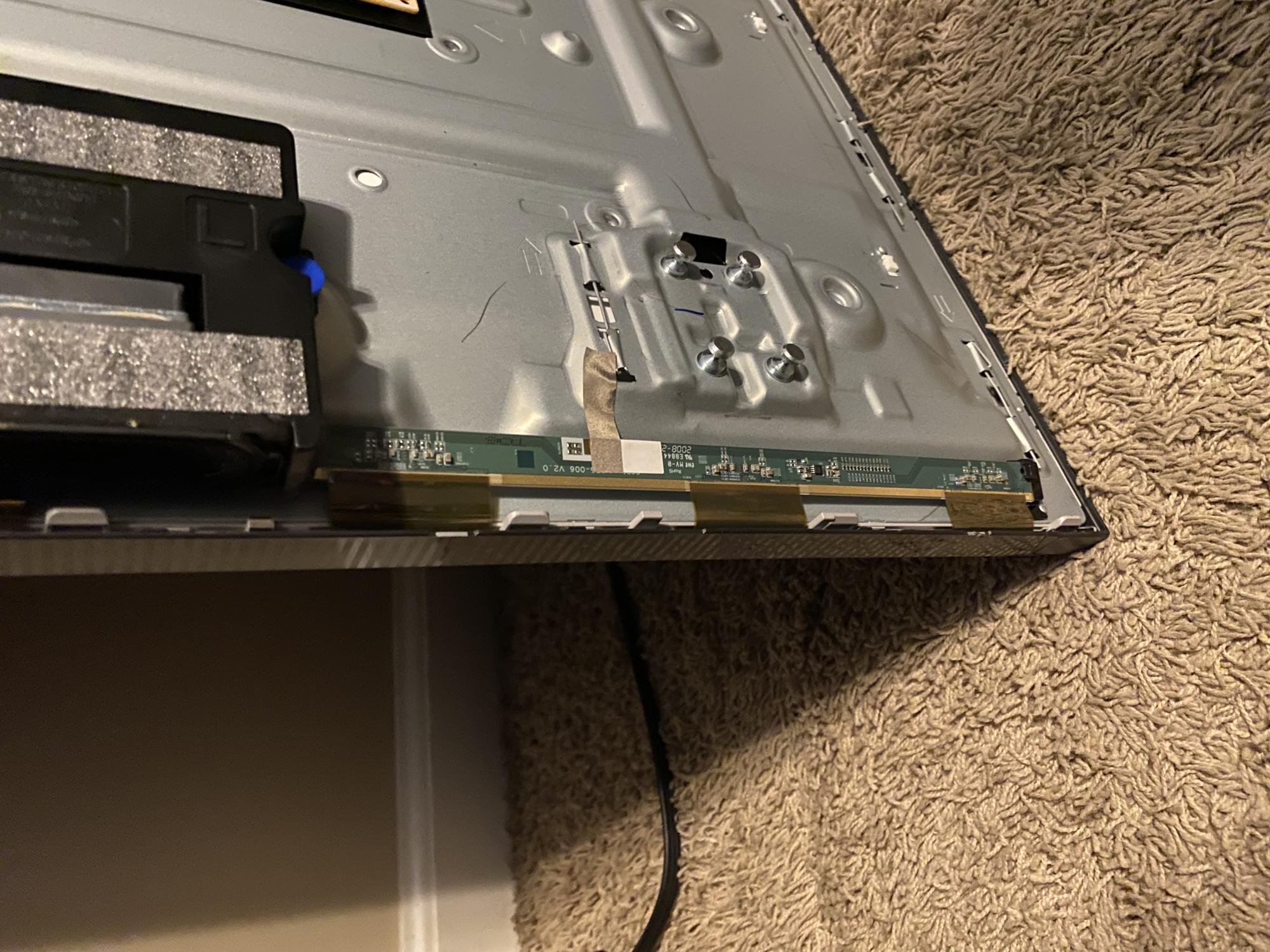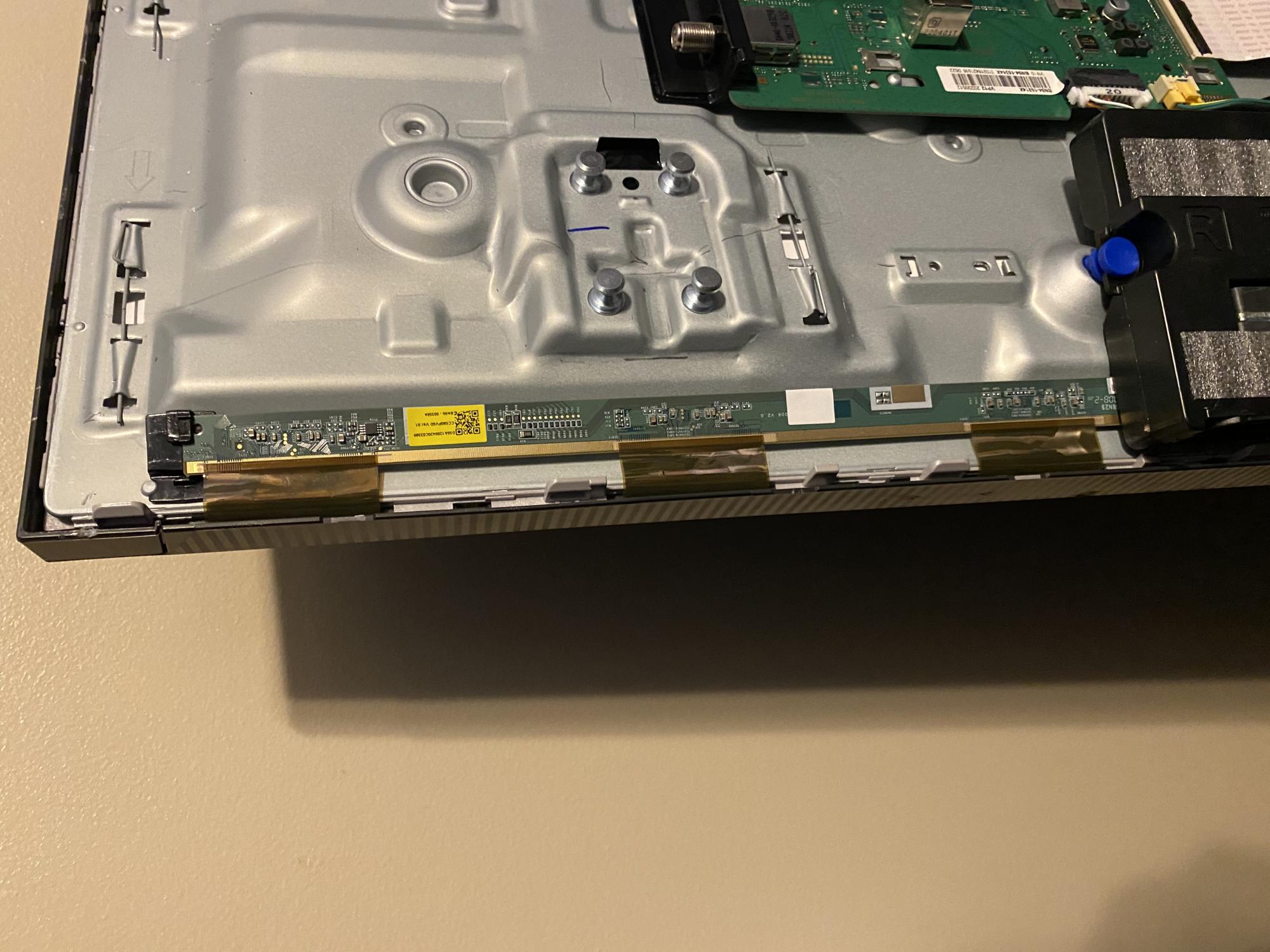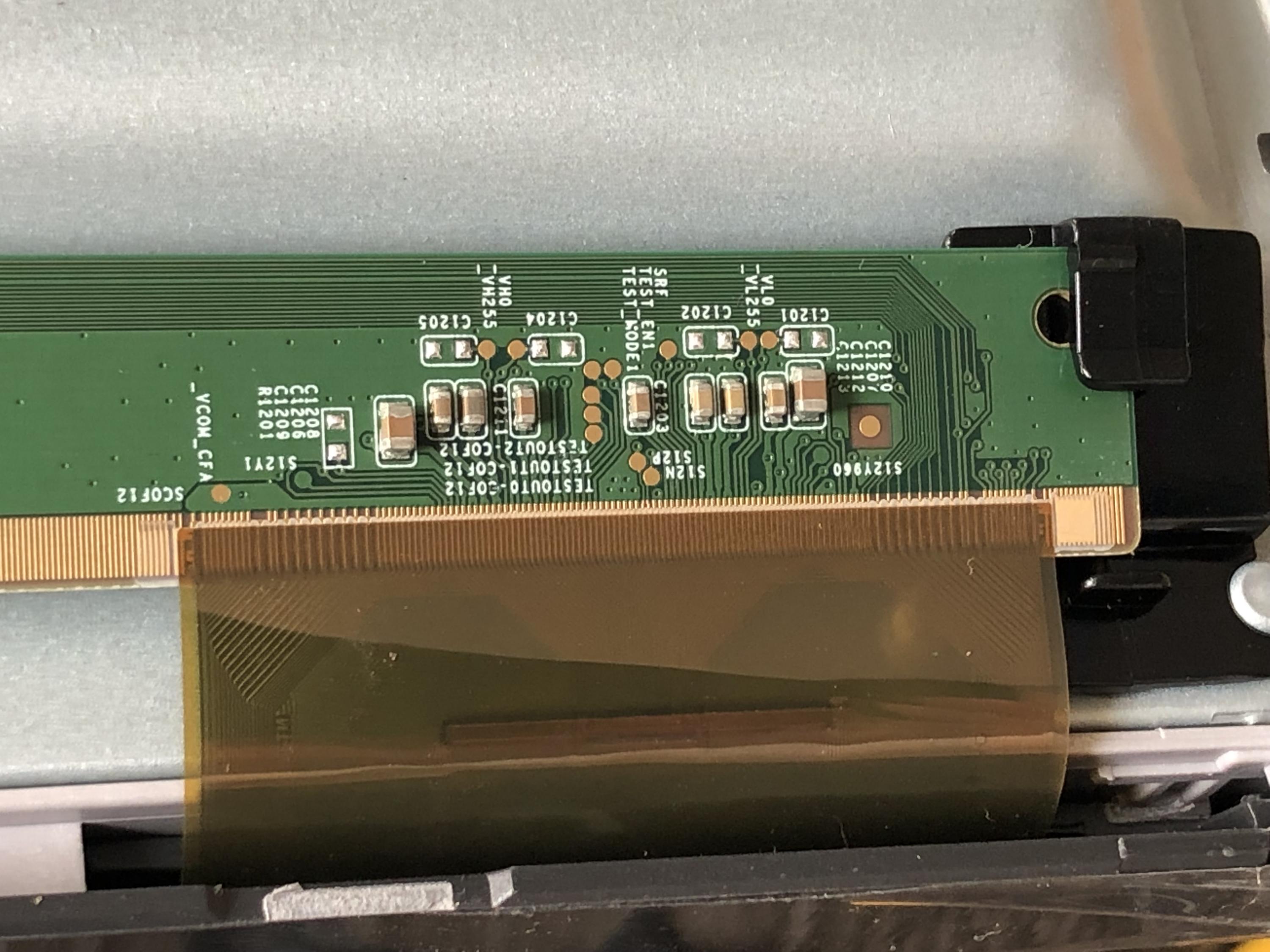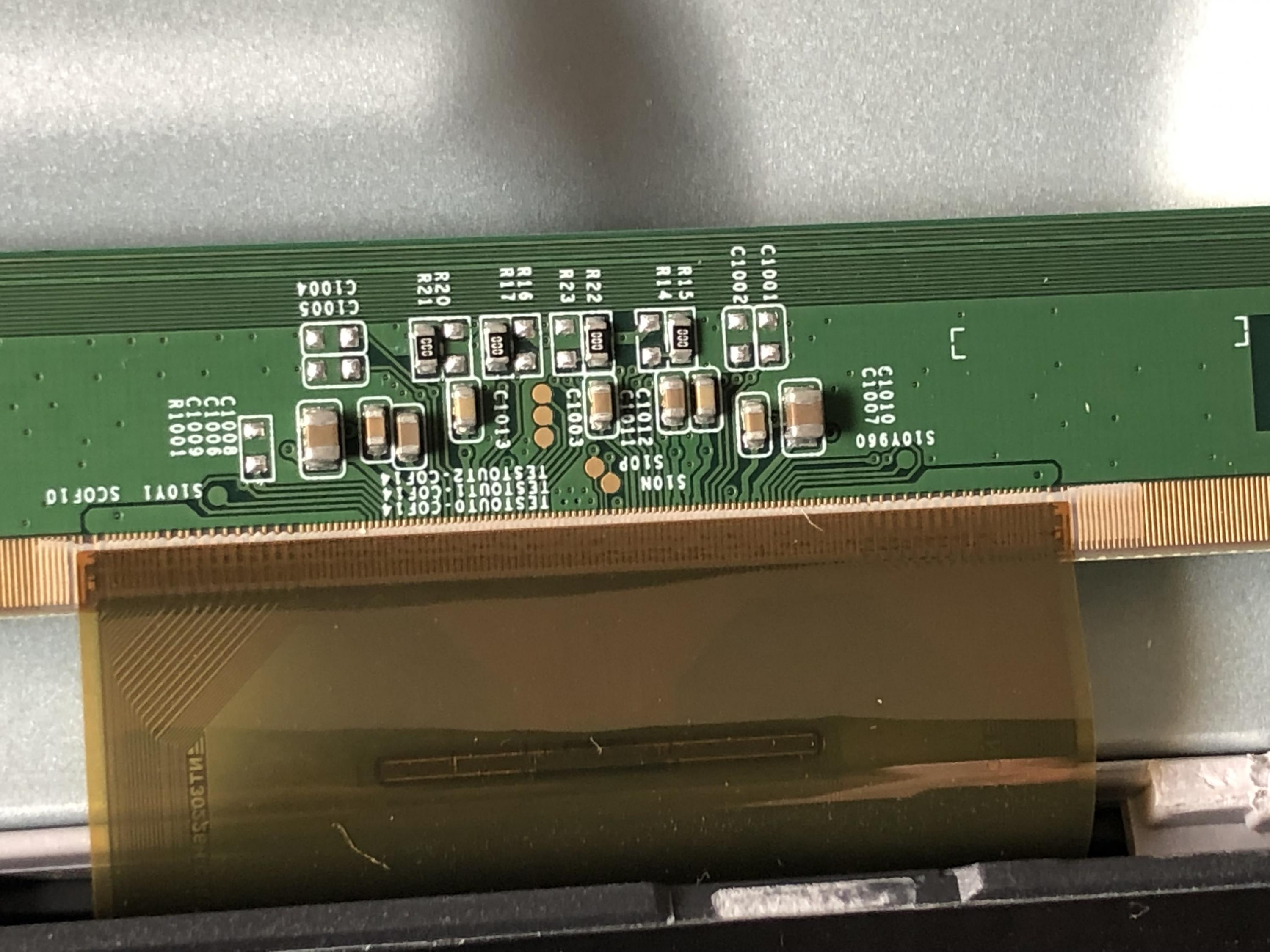 I was thinking it's most likely a bad panel as well, but wanted some confirmation before I scrap it. I checked all the caps on the “driver boards” on mine and didn't see any issues there. The tape trick, blocking some of the pins on the ribbon cable did keep the TV on, but I never could get any image to display (menu, etc..), although I did hear the audio tone when selecting menu, etc.. from the remote. The best I got on the screen were a few lines of different colors. That was slowly testing by covering a few pins of the ribbon cable at a time until the TV stayed on and didn't power cycle.