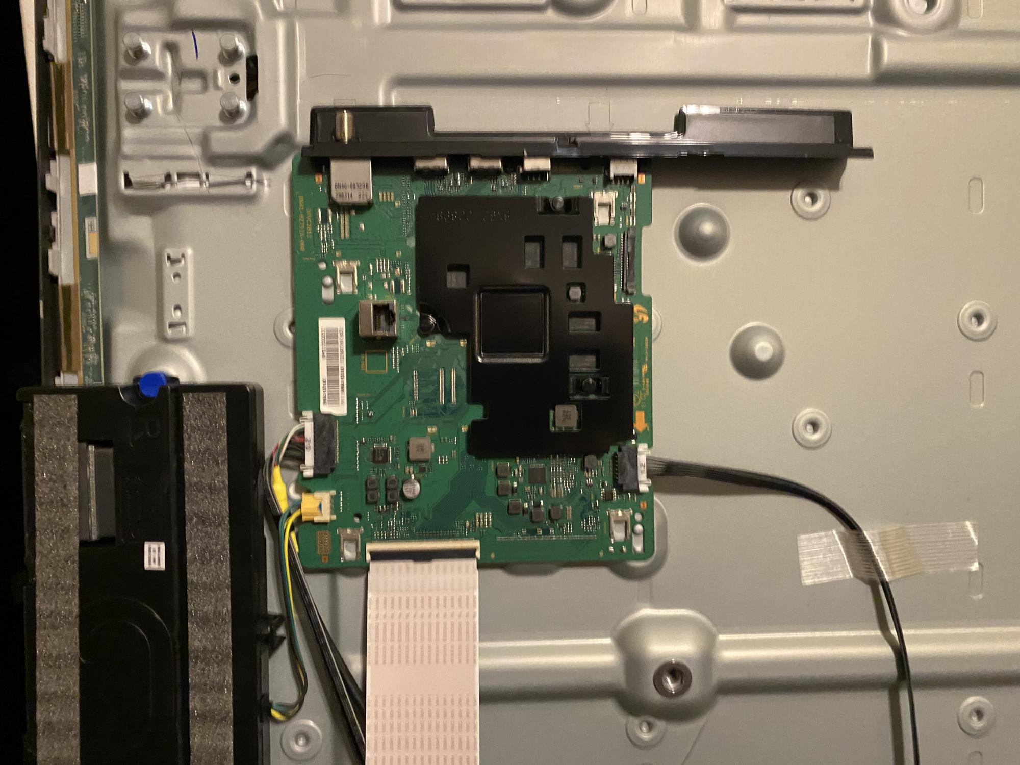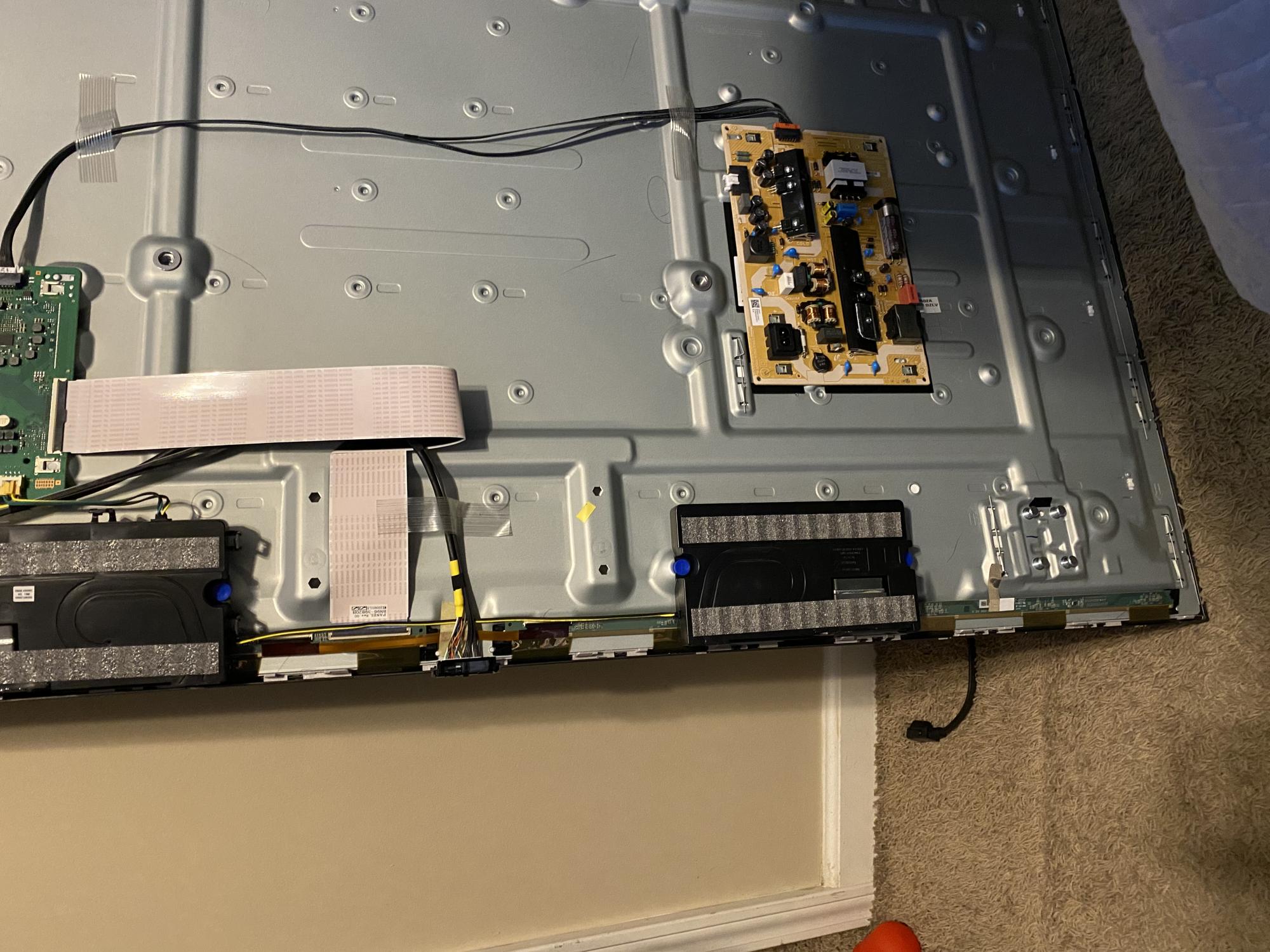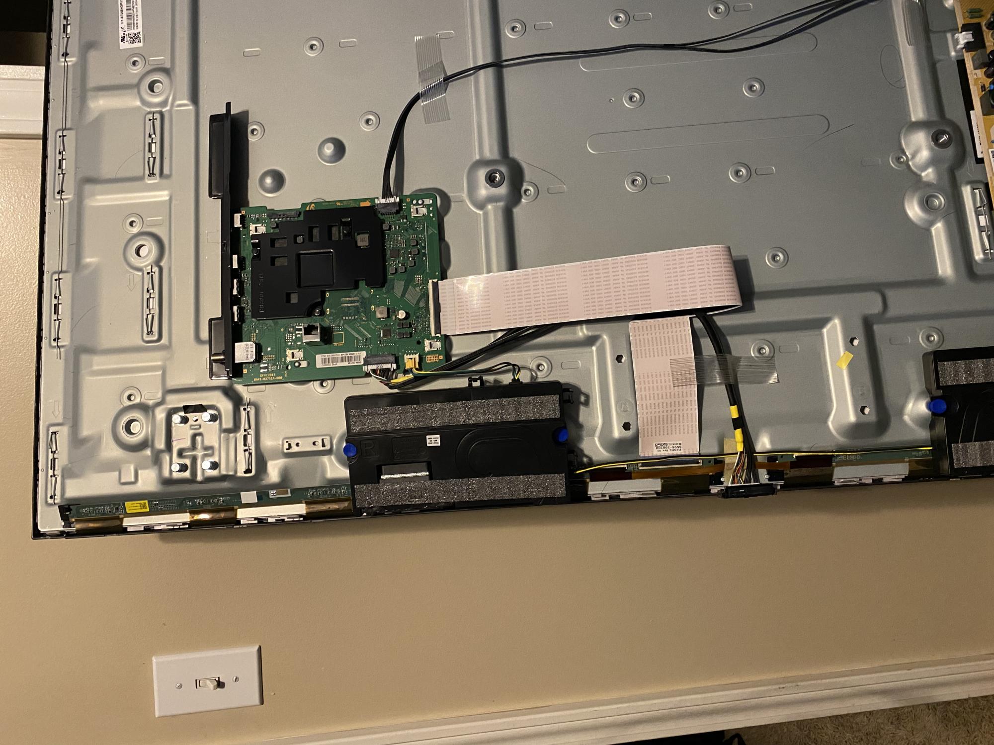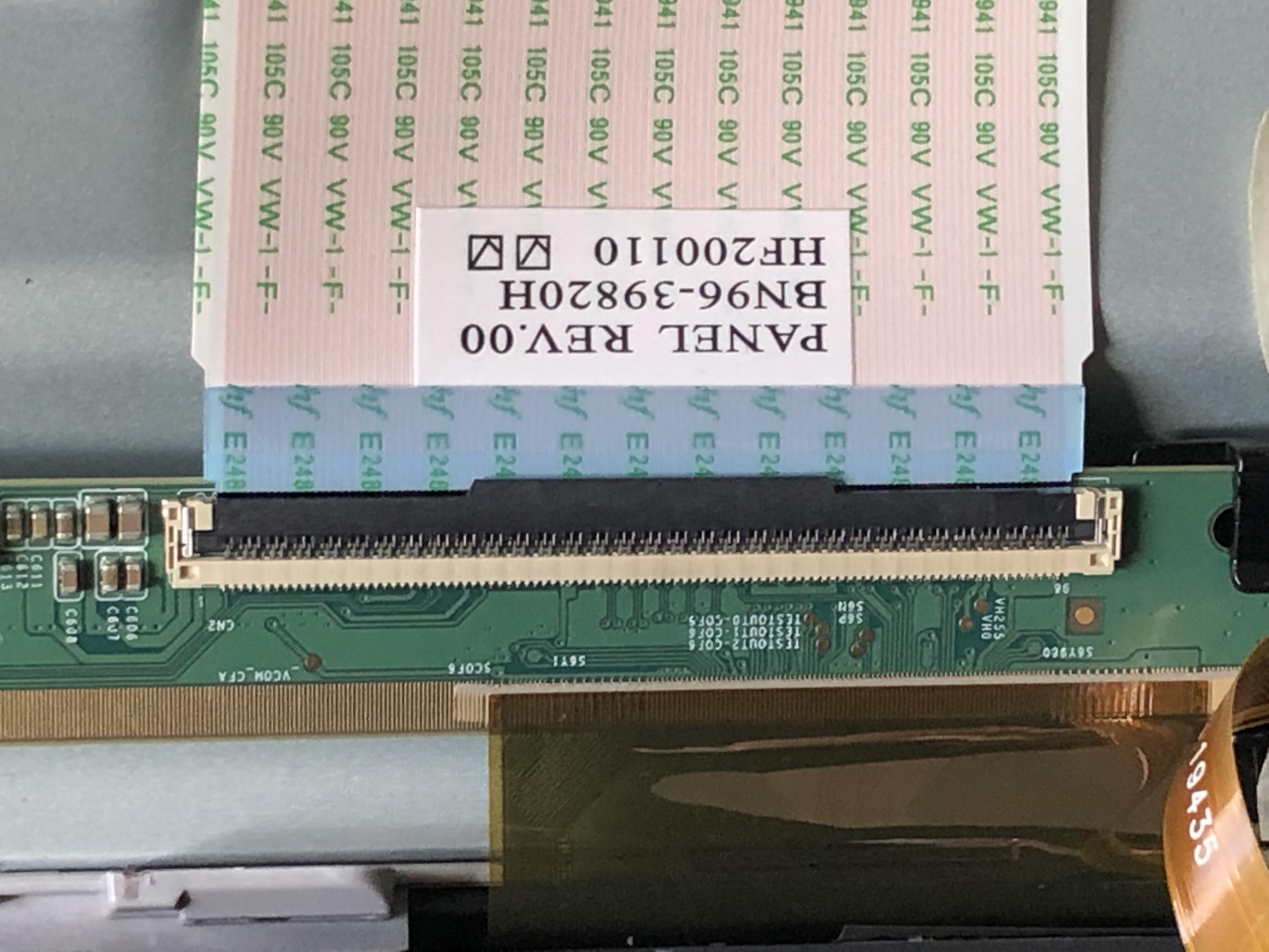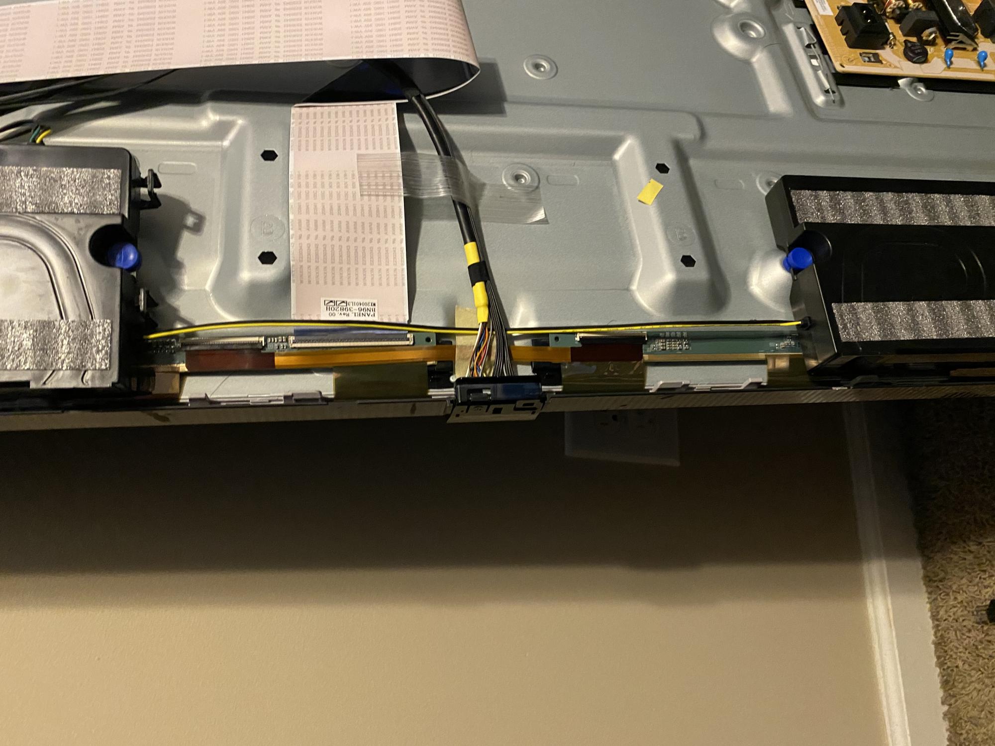 I have a Samsung un58tu7000fxza that powers on (no image, only backlight) but keeps restarting. When it starts up, the backlights seem to be full brightness for 1 sec., off for 1 sec., on again with much lower brightness for 4 sec., full brightness 1 sec., off 6 sec., then repeats. I noticed when the backlights are off, I don’t see the red optical audio port lit, meaning the main board is power cycling. The T-Con must be integrated in this model, because there’s not a separate board. There’s a power board, main board, and driver boards (if that’s what these are called) that are connected directly to the screen ribbon cables down across the bottom. On my main board, there is only one ribbon cable that feeds these driver boards. If I disconnect it, the the TV stays on with backlights at full brightness. I read these models often suffer from bad screens. I did the tape trick to block off some pins in the ribbon and also was able to get the TV to stay powered up without restarting and even heard the start up audio, as well as audio when I used the remote to select menu, etc..). I never could get an image up, but only different line patterns of different colors depending on what pins I had masked off with the tape. I’m trying to isolate the issue to to determine if I have a faulty main board or bad panel. Sounds more like a panel issue since the main board stays powered on with the ribbon disconnected going to the driver boards, but the tape trick never made anything appear on the screen (startup logo, menu text, etc..). Any ideas or suggestions on where to go from here?