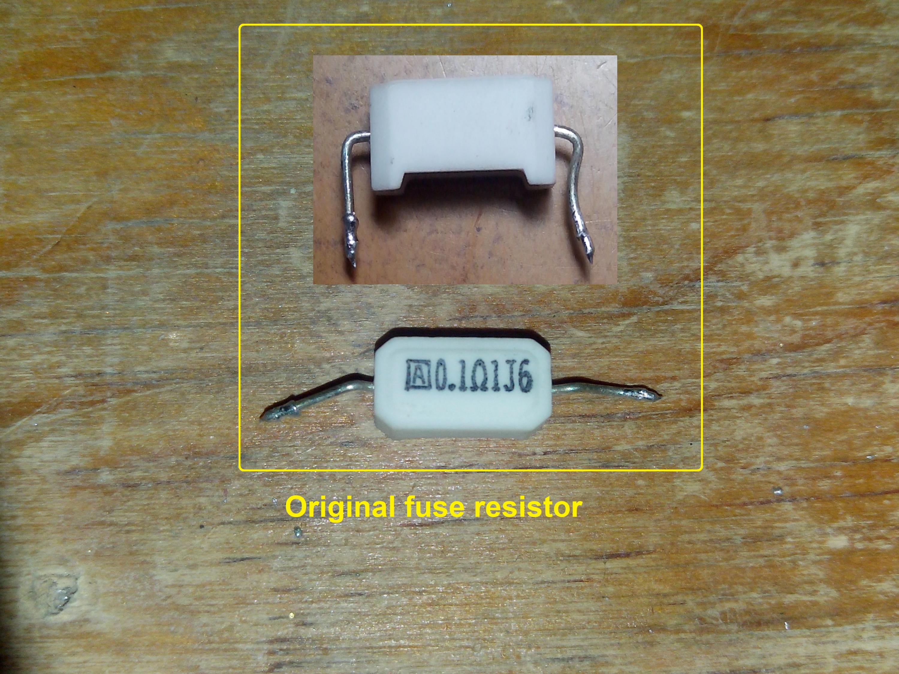 The original fuse resistor was 0.1 Ohm 1/2W. I didn't find a similar fuse resistor and I replaced it with 0.1 Ohm 5W ceramic resistor.