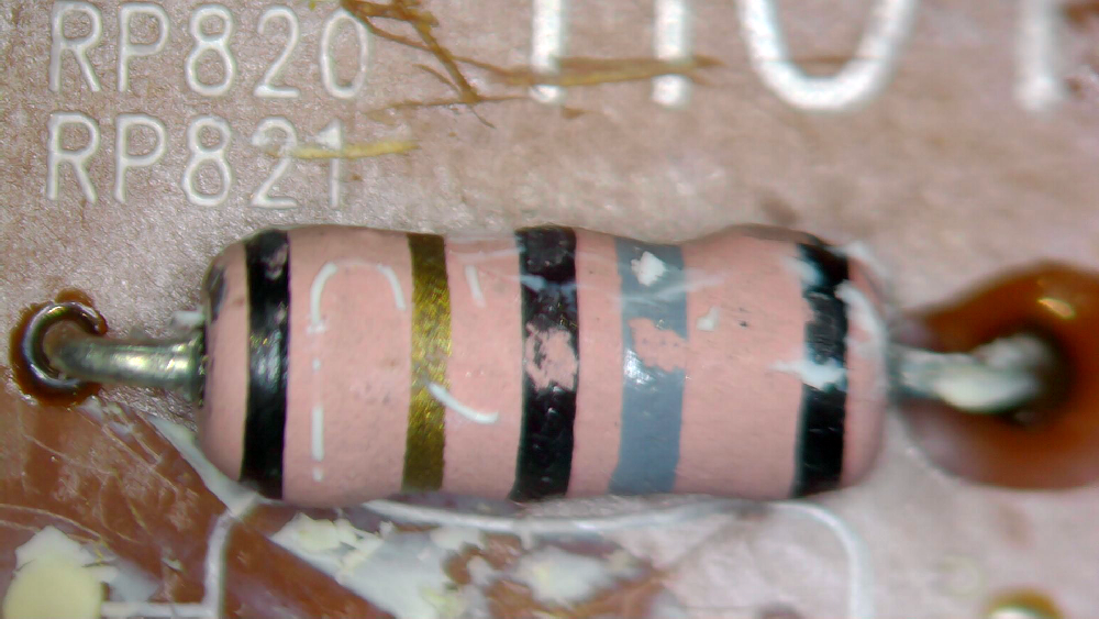 I'm now just guessing at things and tested this resistor RP820 and out of circuit it's 0.11 but I can not find a chart online that the colors work with. Under the scope it looks black, gold, black, gray, black. but this comes as an error on the calculators.Comment