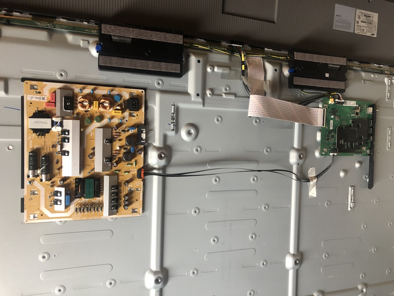 This tv has no image, but does have sound and backlights, when I remove the cable between the ps and main board I have lights. And main board to the panel driver board It goes dim. I did notice the two other panel boards on the edges left and right if I remove the jumpers from the center board the backlights stay on if I connect the jumper the tv goes dim and flickers and 2 red blinks. Need help