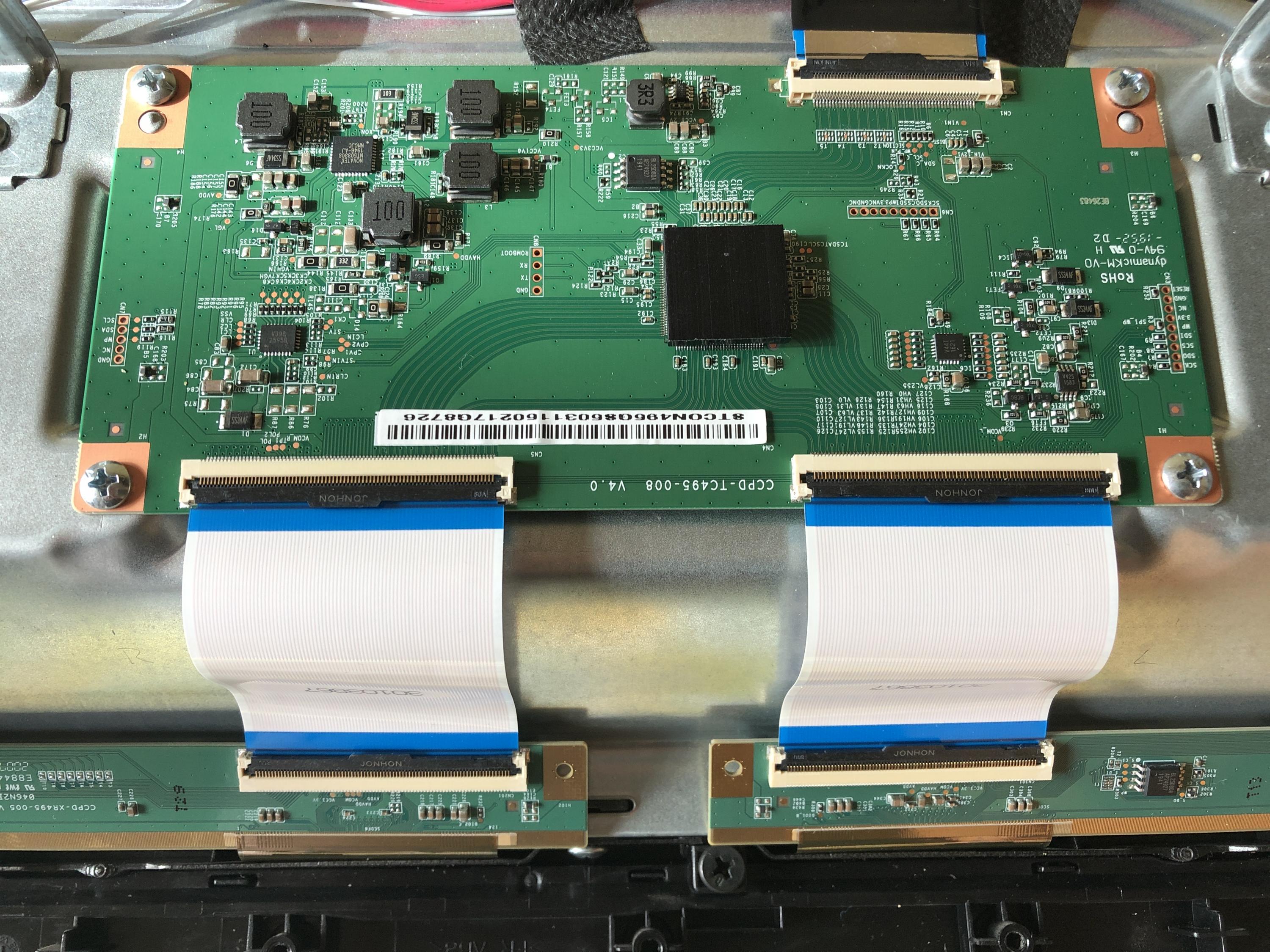 I have replaced the t-con board from a salved tv (identical PCB part number and tv model number) bought from an auction site, and voltages above are from after I replaced the t-con, and the symptoms are the same, so unlikely a t-con issue.