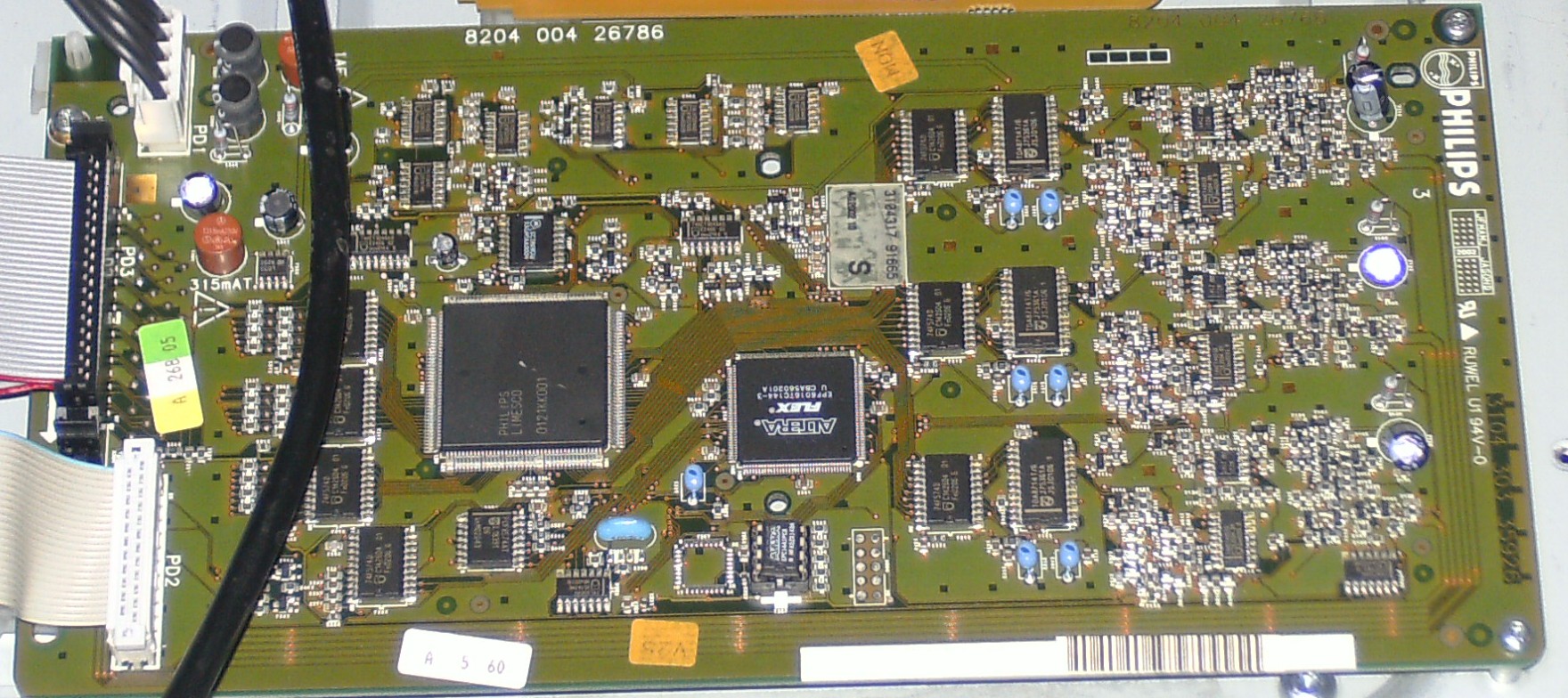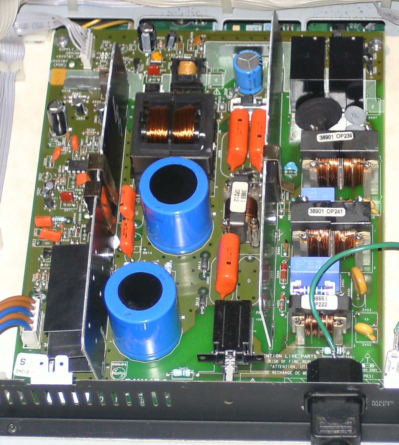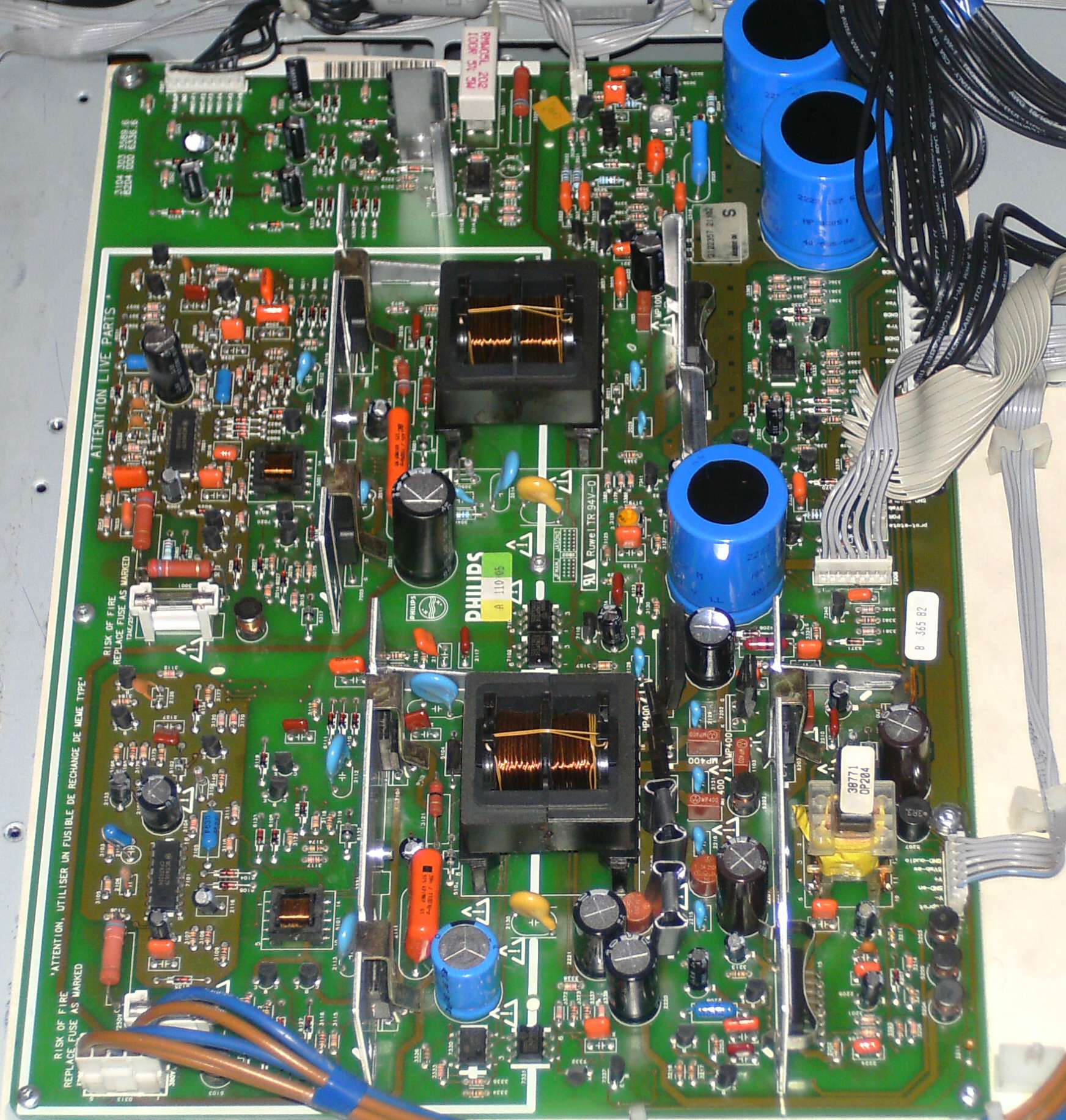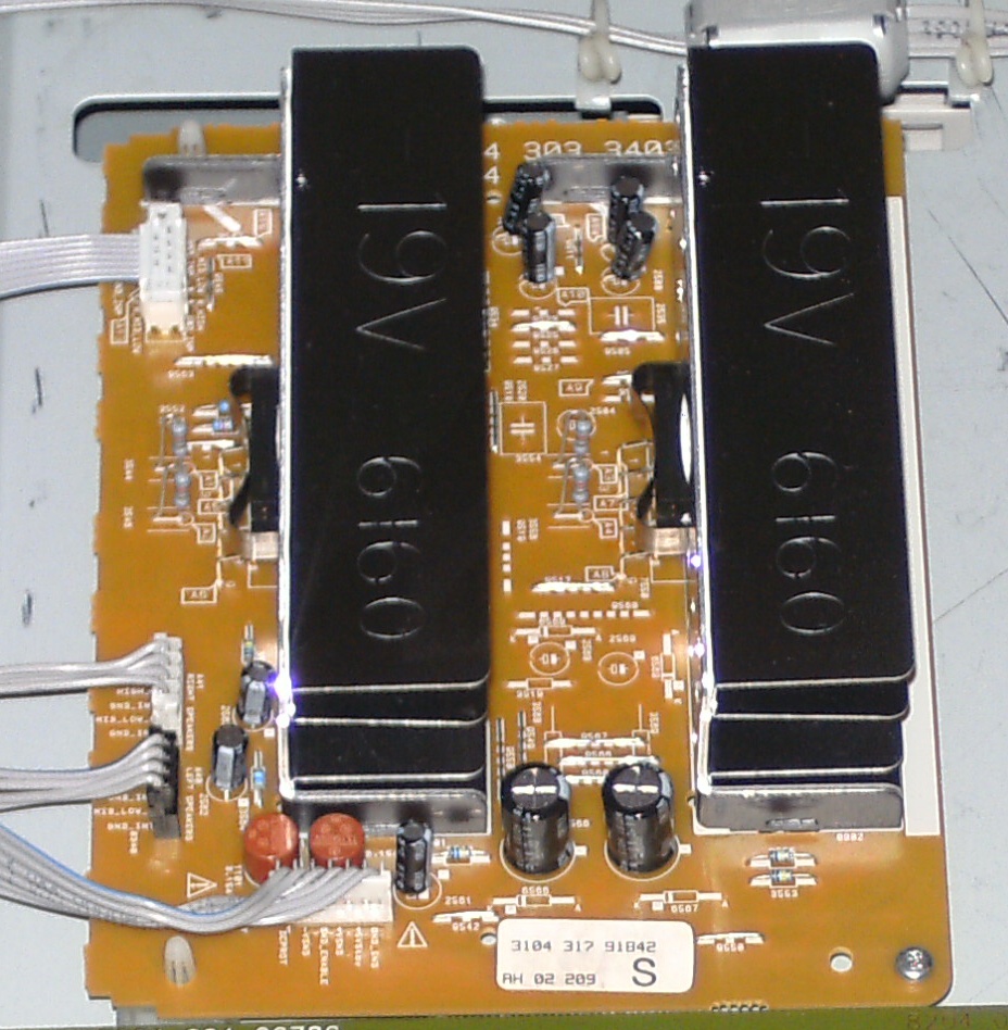 This TV also has PCBs on 2 layers. The back comes off and there are the main power supply board, then another power supply board, the main logic board, the audio amp board, another logic board I don't know what is, and a small board that's not much more than a board for passing a few connections.