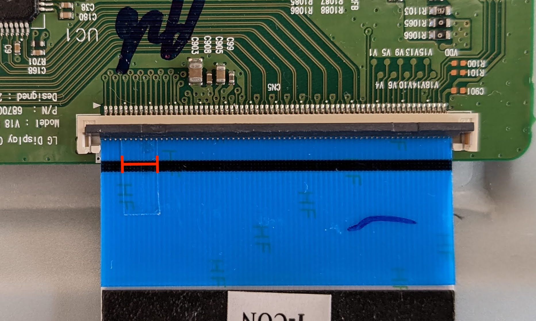 I already opened the back to search for obvious fried components (found none) and replaced the T-CON, but the issue persisted. However, when doing so, I tried to disconnect only one of the ribbon cable bringing the signal from the T-CON to the panel and noticed that, with only the right one connected, the horizontal lines disappeared from the screen. This was not the case with the left one connected, which showed the lines on all panel (even though only half of the screen had an image).