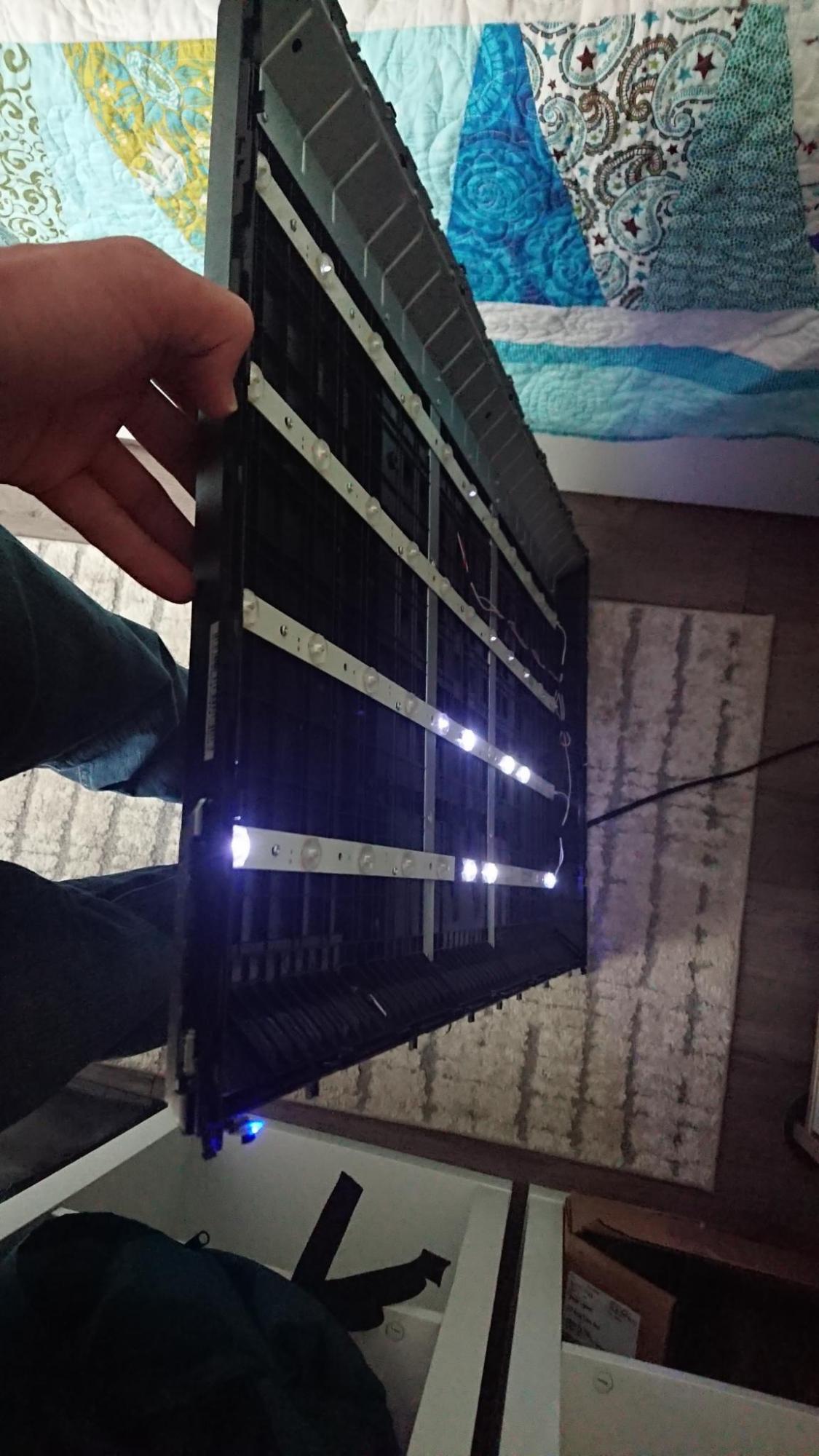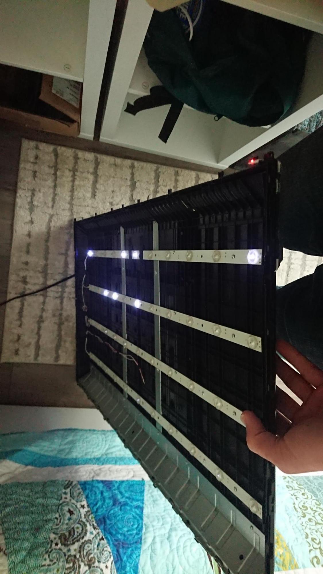 I have a sceptre x405bv TV with bad LED strips. The screen displays dimly over the good LED's, and on disassembling it looks like over half of them are dead tested by multimeter diode test on test points. Plugging it in with the panel disconnected (this TV has a combined power and main board), the backlights immediately receive power when the set is plugged in. When the power button is pressed, it flashes brightly then dims, but additional LED's turn or flicker. When it's turned off again some back lights stay on.