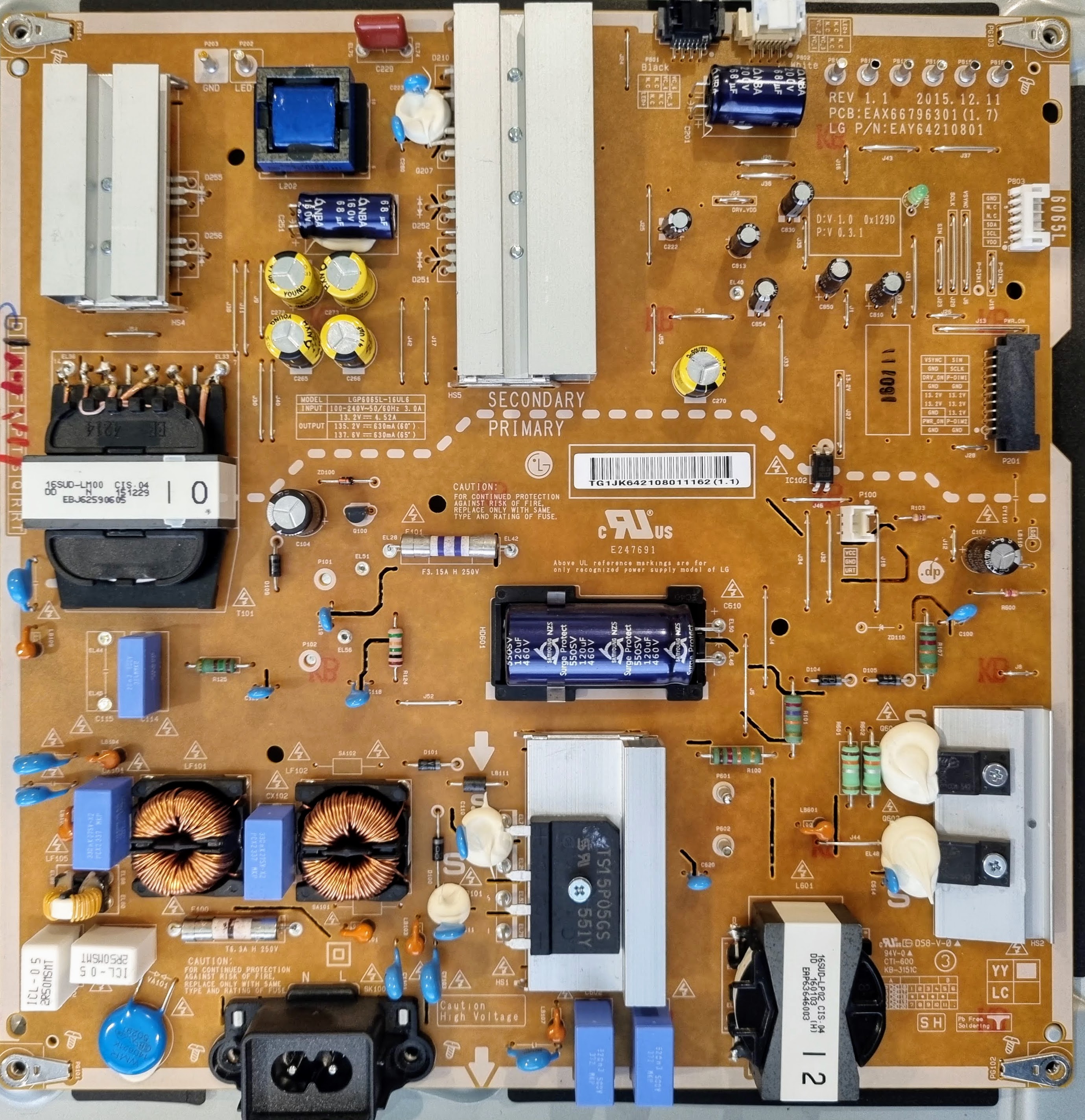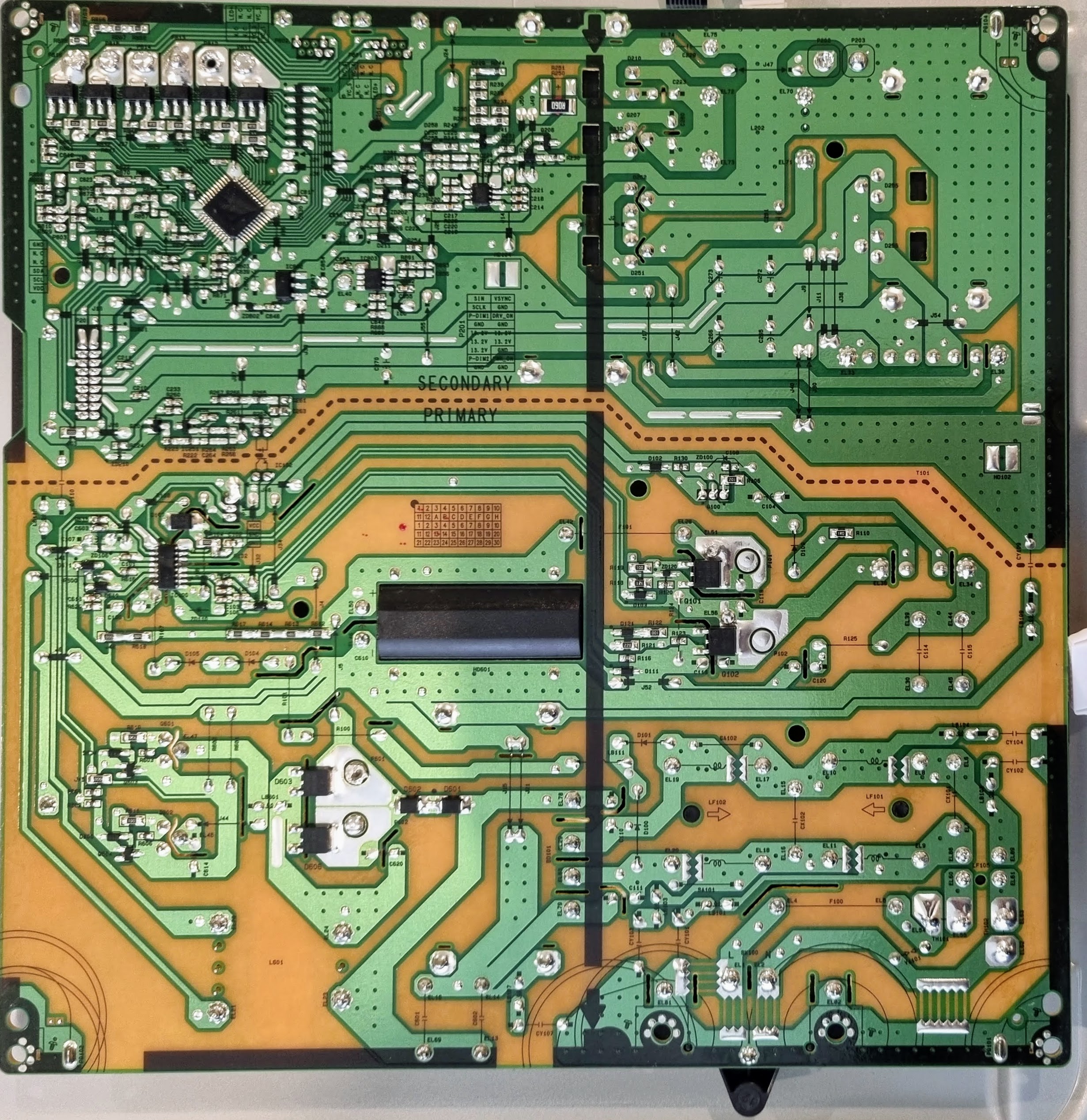 I took off the back and was hoping to find an obvious fault but everything looks pristine, fuses have continuity and none of the caps looked domed or have leaked. Testing the power board voltages on standby has the 13.2V rails oscillating between 11.65 and 11.85 approx every 2 seconds. The LED+ on the black and white leads are also oscillating between 95.9 and 96.1 at the same frequency. Pressing the power button briefly drops the 13.2V rail to 5V but goes back to the previous value. The green led on the power board doesn't light up.