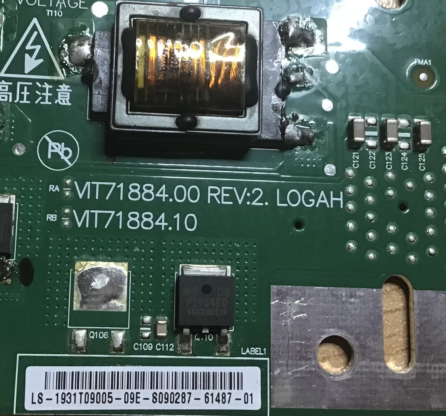 • TV came with vertical bars and no image. Found faulty TVS on left buffer board. Also replaced T-Con (may have damaged the original while hot air removing components, board has slight warp) and have full image but few horizontal lines on the screen. Some of the lines appears to be 2 pixel tall while others are 1 pixel tall.