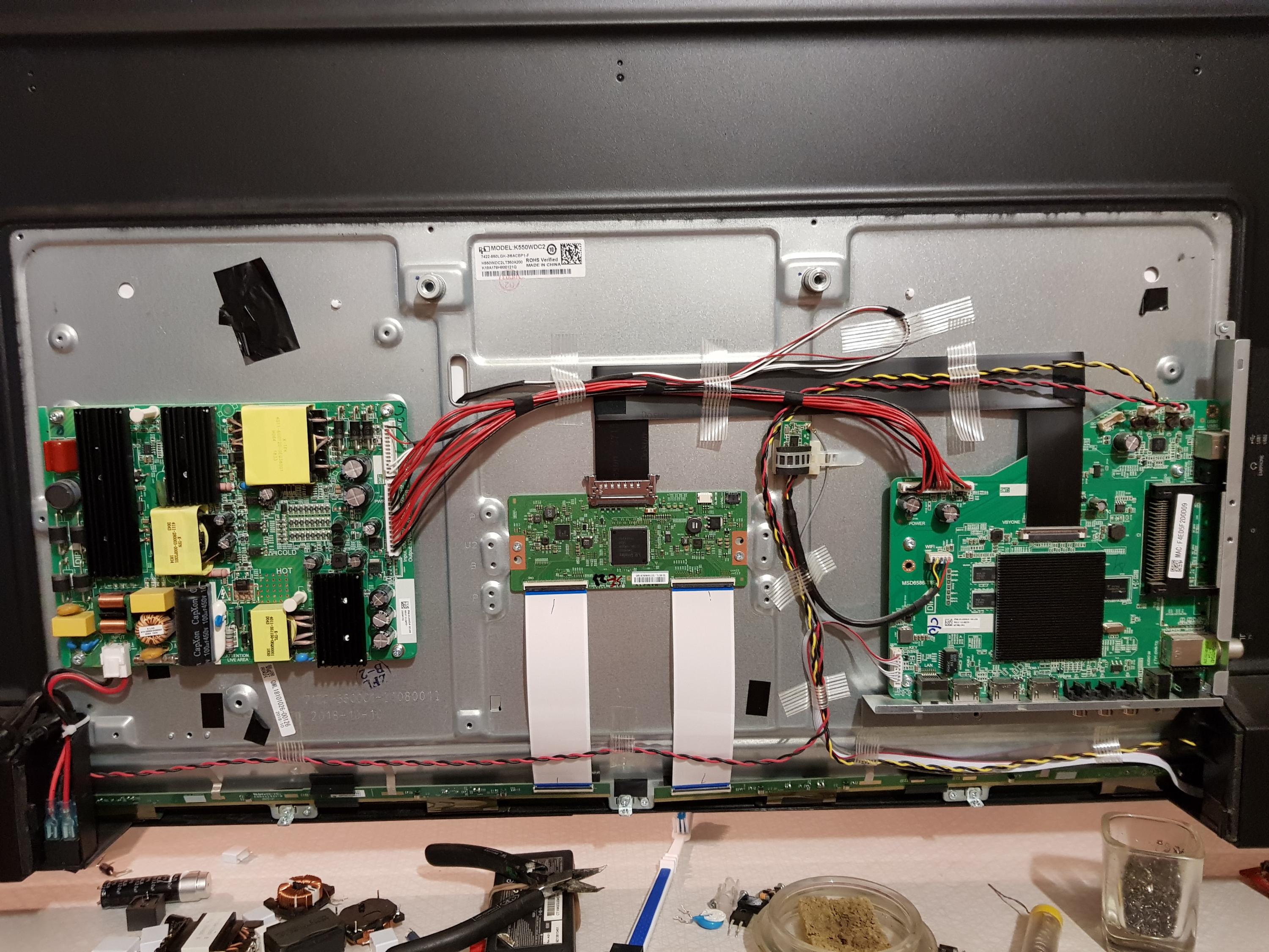 gradual downgrade from 80v from the black/and last white wires. i have done a led test that gives the light on the left half (i sit behind tv) and if you remove the right ribbon from the Tcon i get the half left tv light (facing the tv) only when you press the off button otherwise black square. if you remove the left ribbon you get two stripes on the middle only on the off button otherwise black. led test made power plug unplugged in