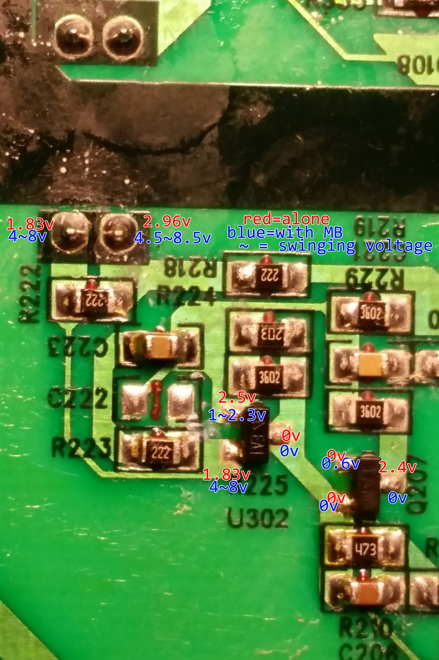 the base of Q207 is 2.4v without MB and 0v with MB ... that seems a bit strange. of course i dont really know what im looking at so maybe thats totally normal!