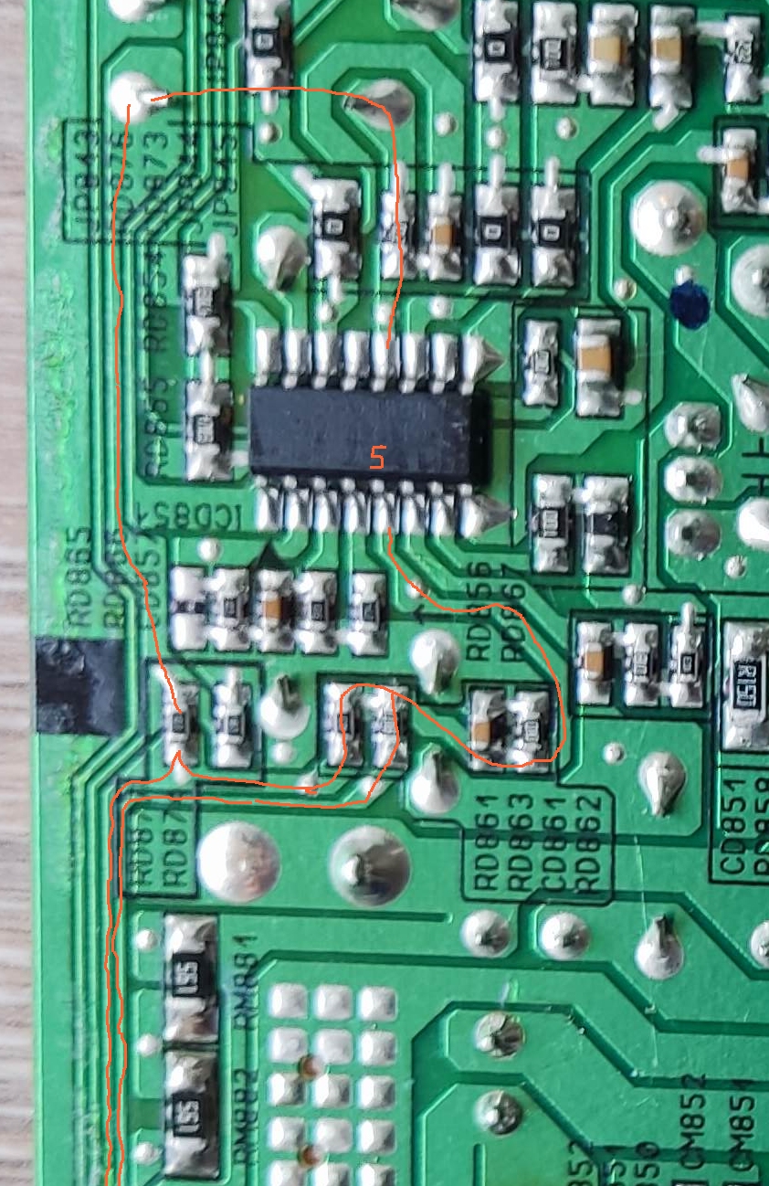 According to the schematic QM851 (the large TO220 mosfet) drives B13V, not B5V. Also tracing the mosfet's Source pin on the real board I get into pins 1-3-5-7 on CN802 which corresponds to B13V