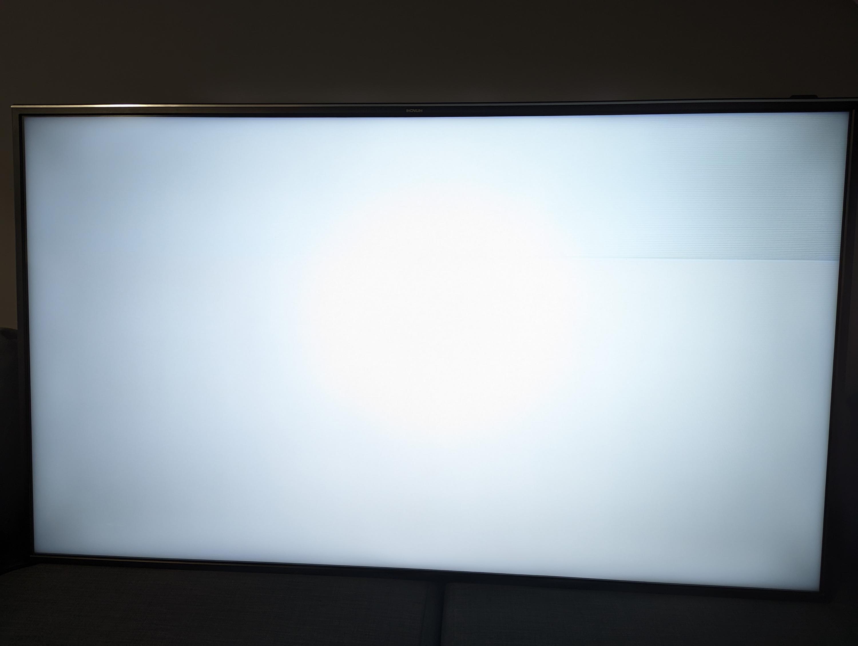 After bringing it home and plugging it in, the TV turned on with its backlight working but had no picture. After removing the back cover, the first thing I tried is to unplug one of the ribbon cables and the situation is as follows.