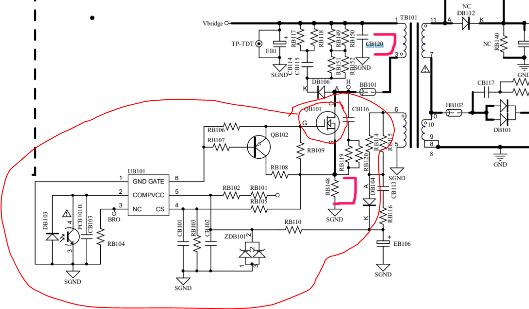 I enclosed a schematic part of power supply - faulty items marked in red -