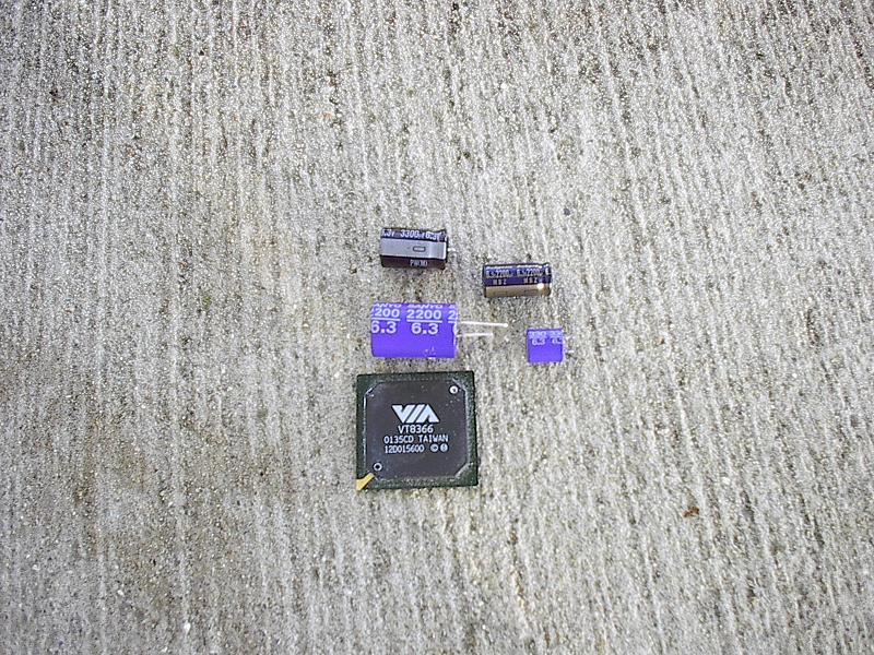 For reference, that's a Via KT266 northbridge, a 330uF 6.3V Oscon (in the size more often seen), a 3300uF Nichicon PW, and a 2200uF Rubycon MBZ.