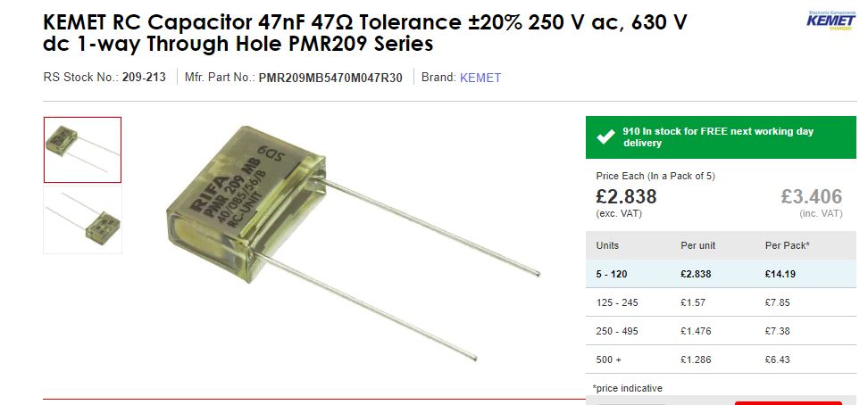 will this be an ideal replacement ? = KEMET RC Capacitor 47nF 47Ω Tolerance ±20% 250 V ac, 630 V dc 1-way Through Hole PMR209 Series