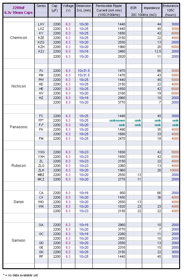 Well, there's impossible for me to get solid polymer caps locally, so i have no interest in making the tables for them. No motivation, hehe Maybe you could volunteer, PCBONEZ?