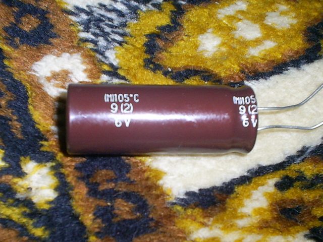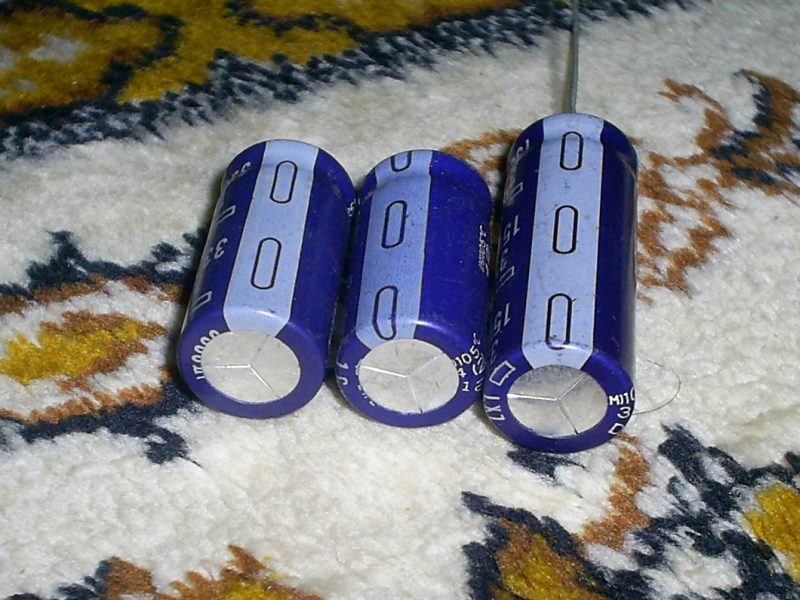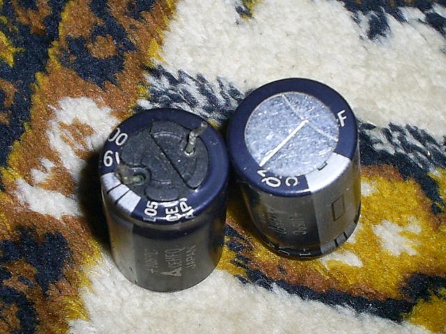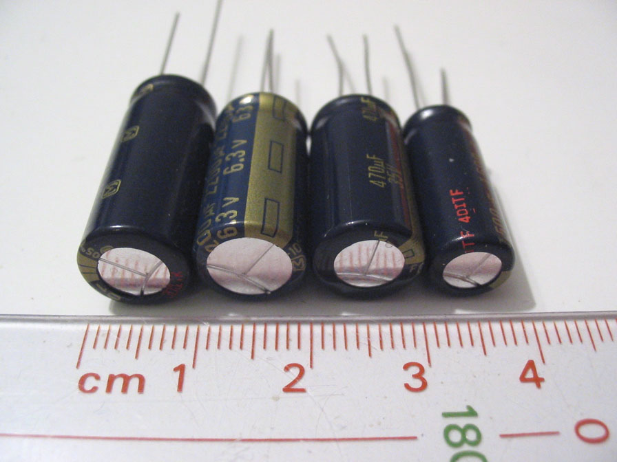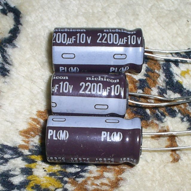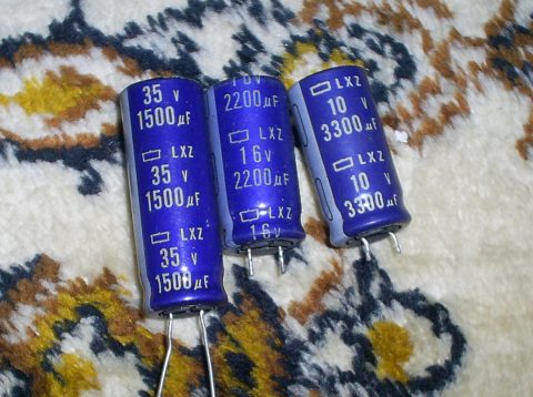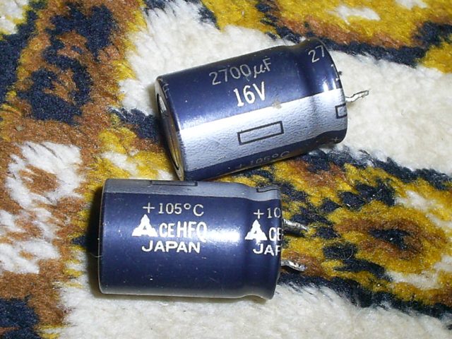 Rubycon YXG. Same remarks as above, dark blue/purple colour instead. Not as good as ZL series but perfectly adequate also. YXH series has longer life than YXG though but with the same impedance specs.