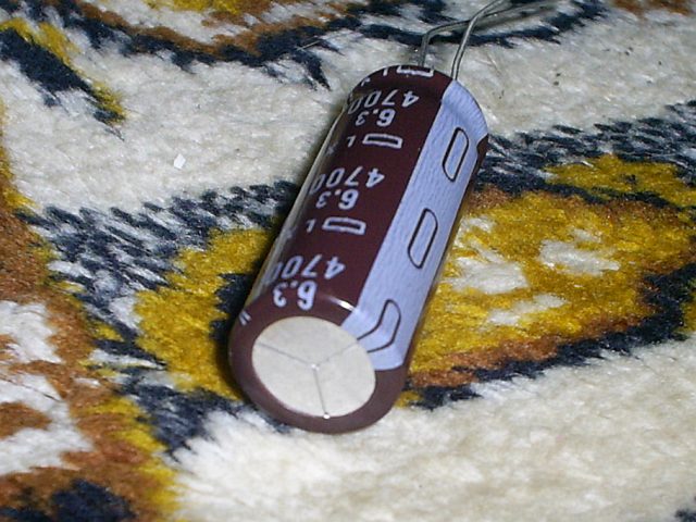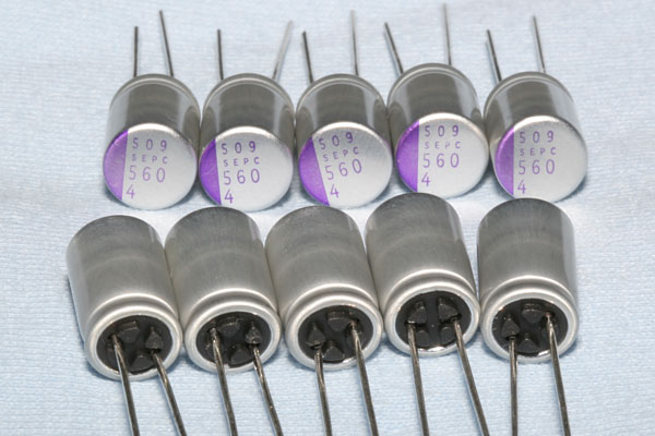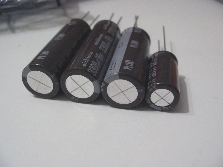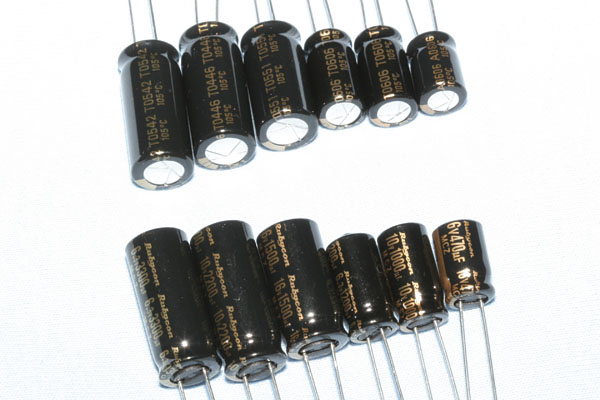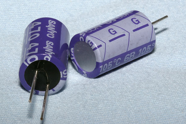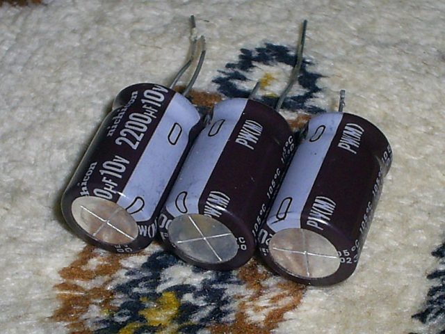 Rubycon YXG. Same remarks as above, dark blue/purple colour instead. Not as good as ZL series but perfectly adequate also. YXH series has longer life than YXG though but with the same impedance specs.