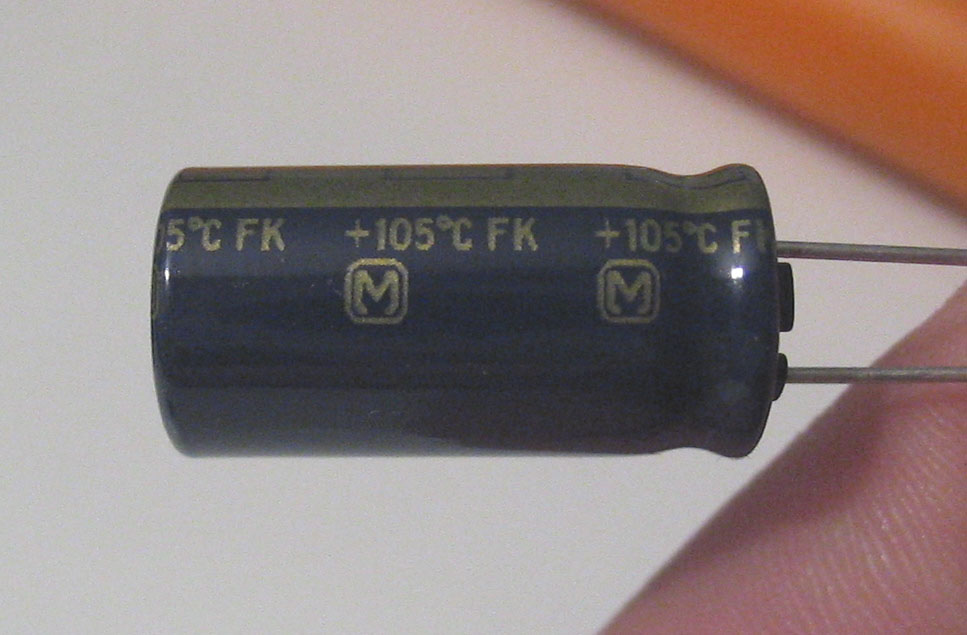 Panasonic FC. Note the T vent marking which is exclusive to panasonic. Note the M character in a box which indicates Matsushita the parent company of the panasonic brand. Note the navy colour, they also come in black, note the gold negative stripe which is on both colours. Note the FC after the +105oC which indicates they are FC range. There is also FA series which is better but FC series is excellent for motherboard applications and general availability is good.